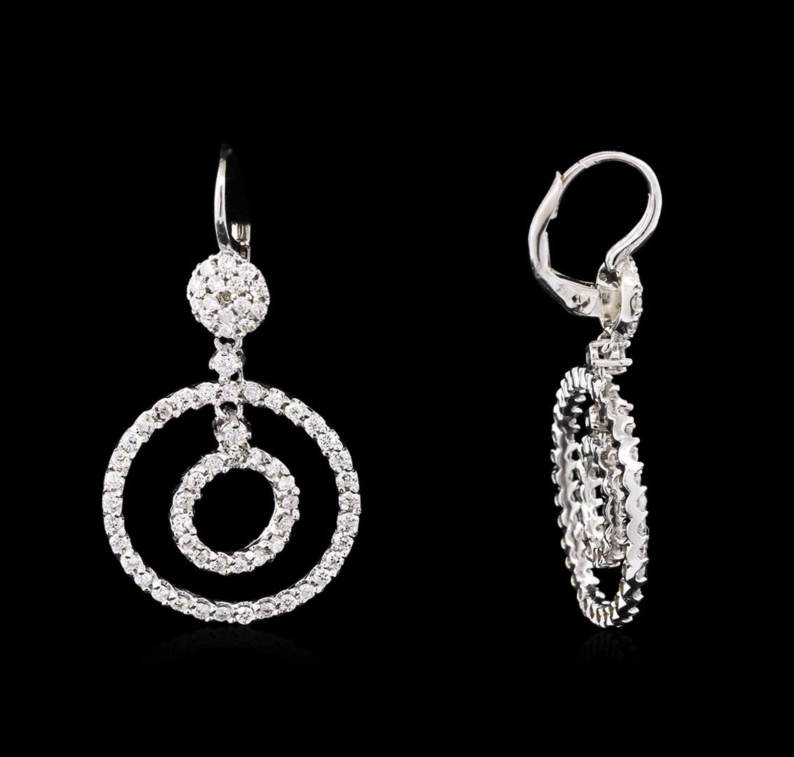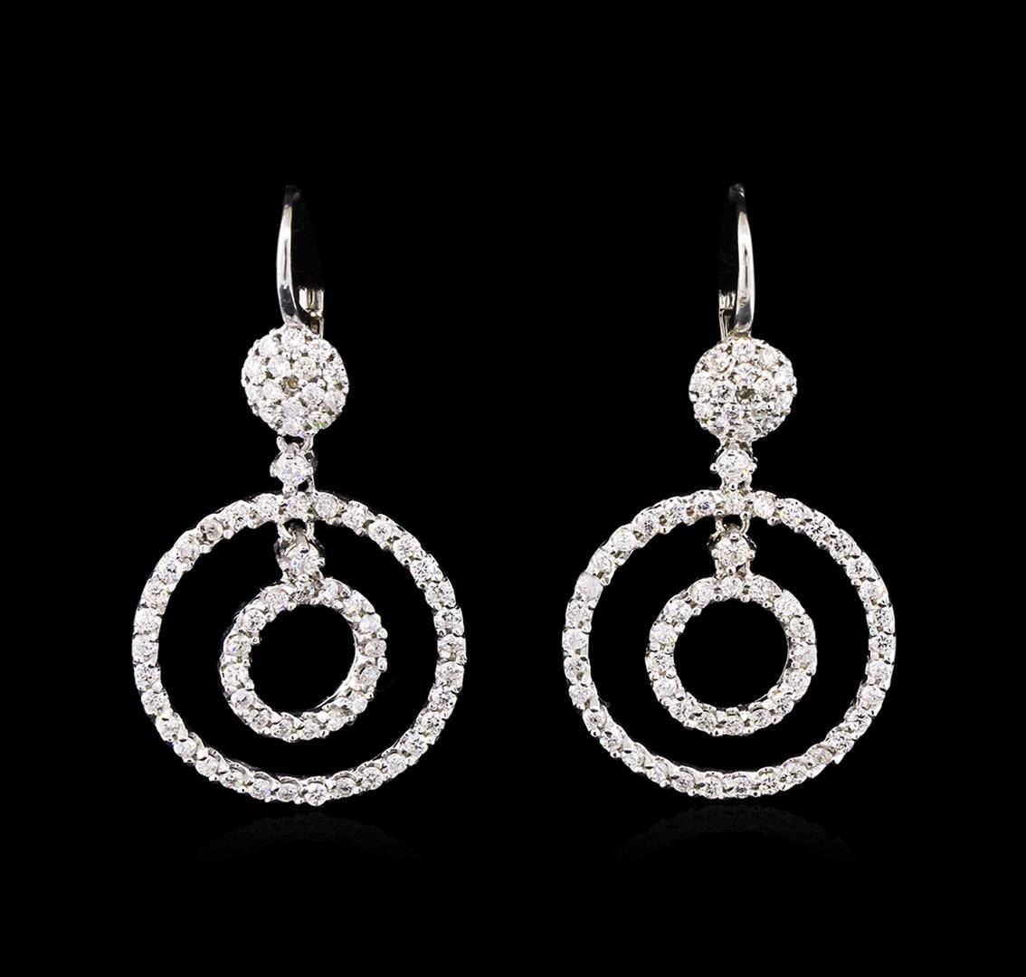 One pair electronically tested 14KT white gold lady's combination cast & assembled dangle earrings with lever backs with a bright polish finish. The featured lady's earrings have a one and a half inch dangling double circle motif. Identified with markings of "K14". Condition is new, good workmanship. Containing: Four prong set round brilliant cut diamonds, measuring 2.20 - 2.10 x 1.40mm (depth est.) approximate total weight of 4 Stones = 0.16ct. Graded in the setting. Clarity: SI-1 to SI-2. Color: G - Good One Hundred Twenty-Eight prong set round brilliant cut diamonds, measuring 1.50 - 1.40 x 0.88mm (depth est.) approximate total weight of 128 Stones = 1.44ct. Graded in the setting. Clarity: SI-1 to SI-2. Color: H - I. Cut Good. Total Weight of Diamonds 1.60ct. Total Weight of Earrings 5.90gm. GAS Appraised at $5,925.00.