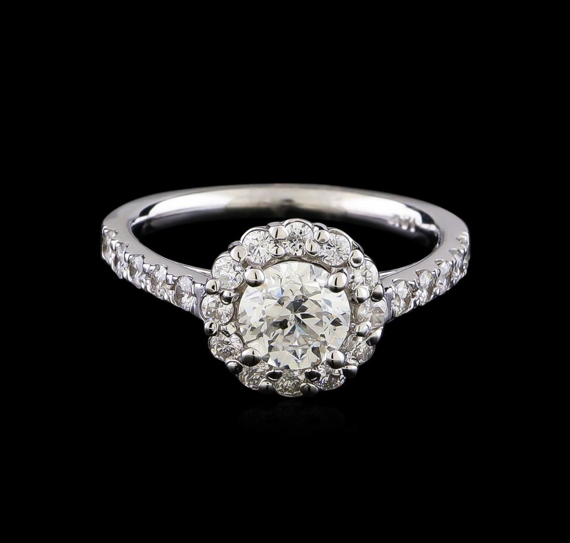 One electronically tested 14KT white gold lady's cast wedding ring with a cathedral halo with a bright polish finish. The featured lady's ring has a shank measuring 1.92 millimeters in width. Identified with markings of "14K". Condition is new, good workmanship. Containing: One prong set round brilliant cut diamond, measuring 6.17 - 6.13 x 4.04mm (depth est.) , 5.00.%. GTCF approximate weight of 1.00ct. Graded in the setting. Clarity: I-1. Color: G - Very Good Ten prong set round brilliant cut diamonds, measuring 2.00 - 1.95 x 1.25mm (depth est.) approximate total weight of 10 Stones = 0.30ct. Graded in the setting. Clarity: SI-1 to SI-2. Color: H - I. Cut Good Twelve prong set round brilliant cut diamonds, measuring 1.90 - 1.85 x 1.15mm (depth est.) approximate total weight of 12 Stones = 0.30ct. Graded in the setting. Clarity: SI-1 to I-1. Color: H - I. Cut Good. Total Weight of Diamonds 1.60ct. Total Weight of Ring 3.70gm. GAS Appraised at $13,115.00.