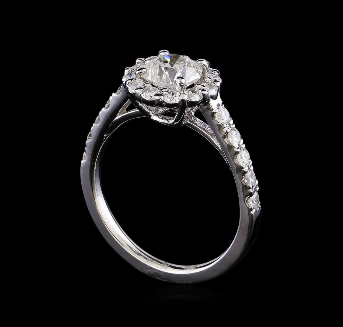 One electronically tested 14KT white gold lady's cast wedding ring with a cathedral halo with a bright polish finish. The featured lady's ring has a shank measuring 1.92 millimeters in width. Identified with markings of "14K". Condition is new, good workmanship. Containing: One prong set round brilliant cut diamond, measuring 6.17 - 6.13 x 4.04mm (depth est.) , 5.00.%. GTCF approximate weight of 1.00 ct. Graded in the setting. Clarity: I-1. Color: G - Very Good Ten prong set round brilliant cut diamonds, measuring 2.00 - 1.95 x 1.25mm (depth est.) approximate total weight of 10 Stones = 0.30 ct. Graded in the setting. Clarity: SI-1 to SI-2. Color: H - I. Cut Good Twelve prong set round brilliant cut diamonds, measuring 1.90 - 1.85 x 1.15mm (depth est.) approximate total weight of 12 Stones = 0.30 ct. Graded in the setting. Clarity: SI-1 to I-1. Color: H - I. Cut Good. Total Weight of Diamonds 1.60 ct. Total Weight of Ring 3.70gm. GAS Appraised.