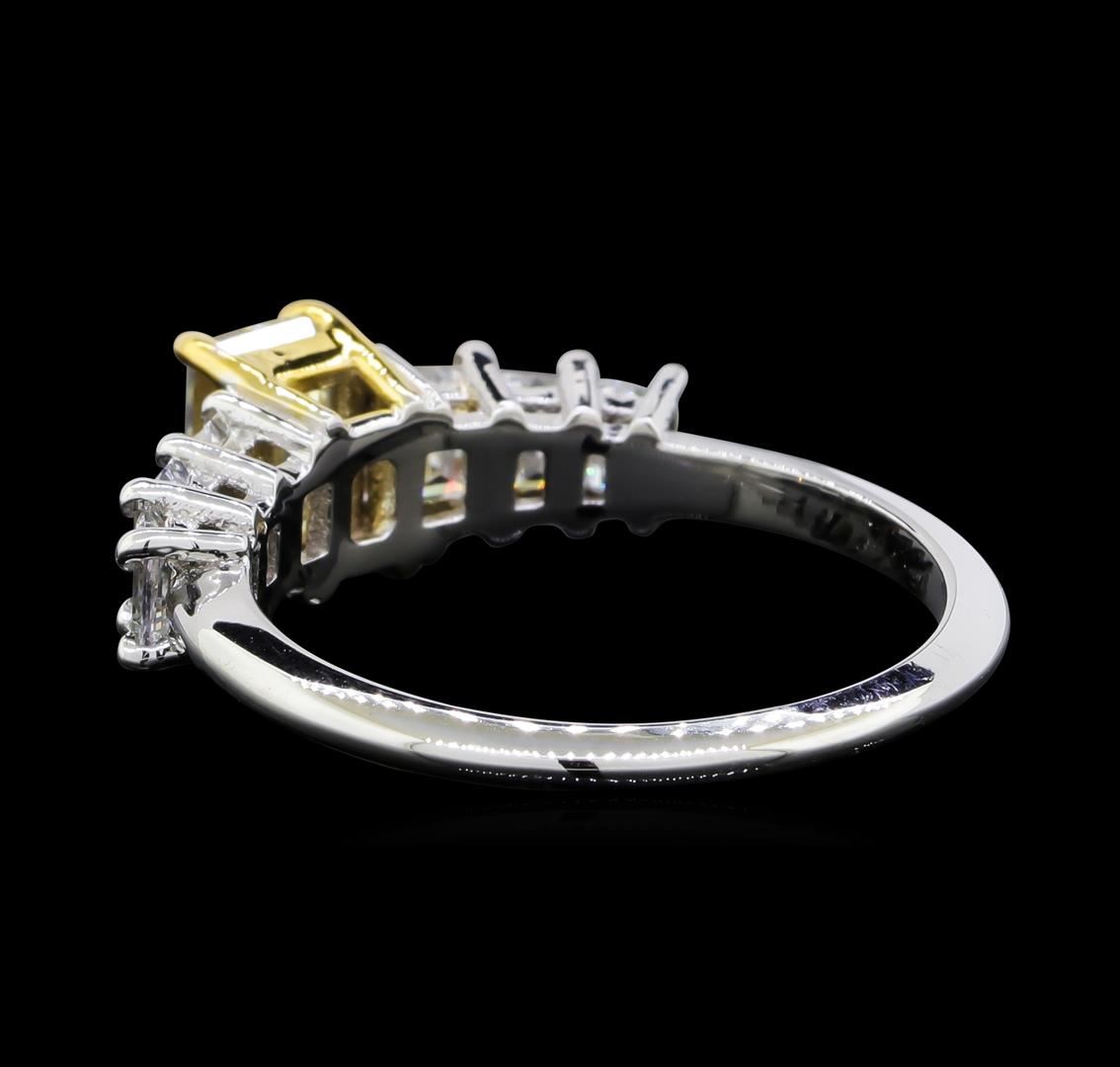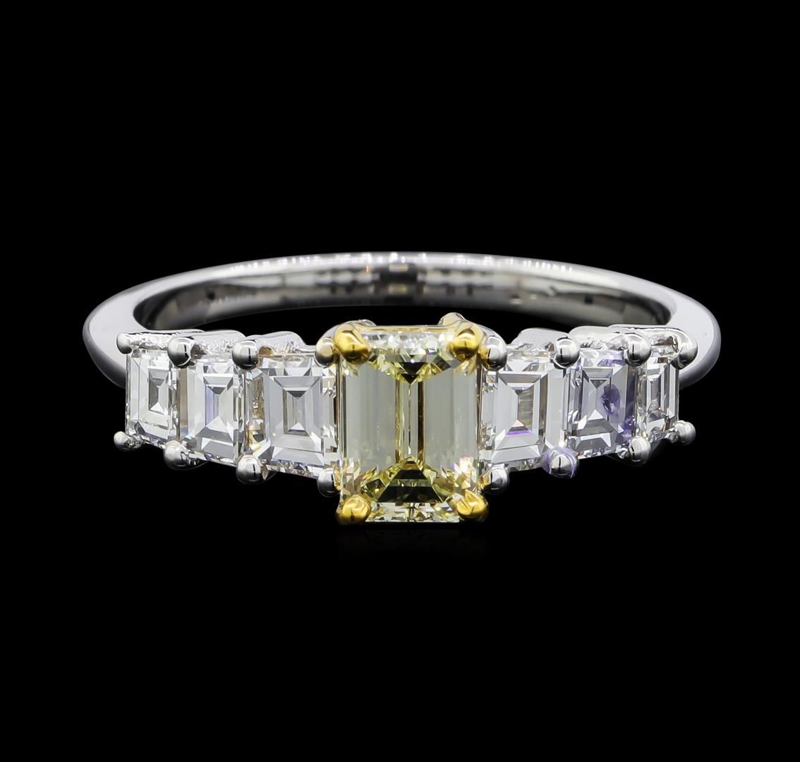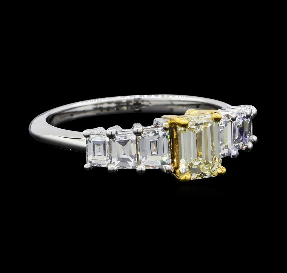 One electronically tested 14KT white and yellow gold lady's cast 7-stone strGASht line ring with a cathedral shank with a bright polish finish. The featured lady's ring has a shank measuring 1.66 millimeters wide. Identified with markings of '14K'. Condition is new, good workmanship. Containing: One prong set emerald cut diamond, measuring 5.80 x 4.10 x 2.80mm (depth est.) approximate weight of 0.60ct. Graded in the setting. Clarity VS-1 Cut Very Good Six prong set step trapezoid cut diamonds, measuring 3.35 x 2.80 x 2.00mm (depth est.) approximate total weight of 6 Stones = 1.00ct. Graded in the setting. Clarity VS-1 to VS-2. Color: G - H Cut Good. Total Weight of Diamonds 1.60ct.. Total Weight of Ring 2.70gm. GAS Appraised at $9,440.00.