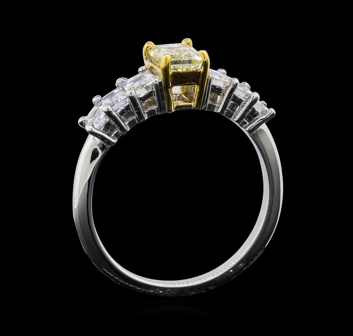 One electronically tested 14KT white and yellow gold lady's cast 7-stone strGASht line ring with a cathedral shank with a bright polish finish. The featured lady's ring has a shank measuring 1.66 millimeters wide. Identified with markings of '14K'. Condition is new, good workmanship. Containing: One prong set emerald cut diamond, measuring 5.80 x 4.10 x 2.80mm (depth est.) approximate weight of 0.60ct. Graded in the setting. Clarity VS-1 Cut Very Good Six prong set step trapezoid cut diamonds, measuring 3.35 x 2.80 x 2.00mm (depth est.) approximate total weight of 6 Stones = 1.00ct. Graded in the setting. Clarity VS-1 to VS-2. Color: G - H Cut Good. Total Weight of Diamonds 1.60ct.. Total Weight of Ring 2.70gm. GAS Appraised at $9,440.00.