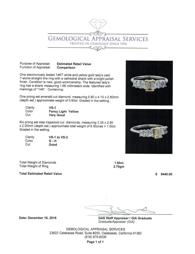One electronically tested 14KT white and yellow gold lady's cast 7-stone strGASht line ring with a cathedral shank with a bright polish finish. The featured lady's ring has a shank measuring 1.66 millimeters wide. Identified with markings of '14K'. Condition is new, good workmanship. Containing: One prong set emerald cut diamond, measuring 5.80 x 4.10 x 2.80mm (depth est.) approximate weight of 0.60ct. Graded in the setting. Clarity VS-1 Cut Very Good Six prong set step trapezoid cut diamonds, measuring 3.35 x 2.80 x 2.00mm (depth est.) approximate total weight of 6 Stones = 1.00ct. Graded in the setting. Clarity VS-1 to VS-2. Color: G - H Cut Good. Total Weight of Diamonds 1.60ct.. Total Weight of Ring 2.70gm. GAS Appraised at $9,440.00.