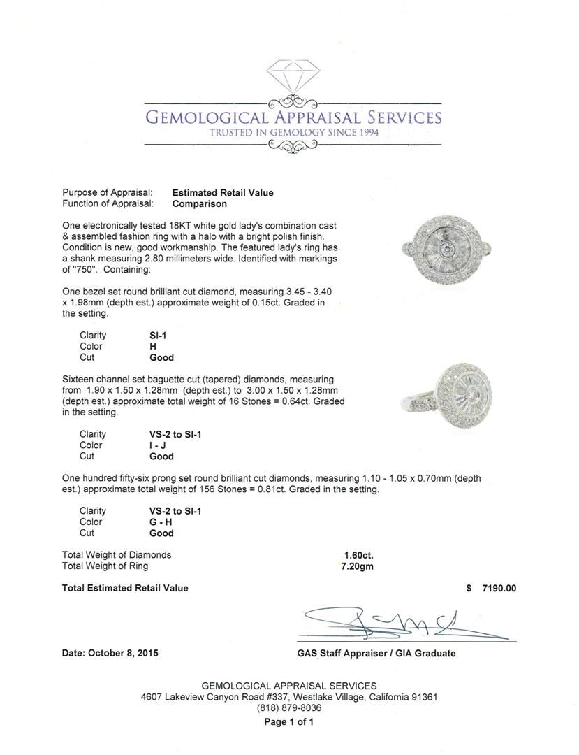 One electronically tested 18KT white gold lady's combination cast & assembled fashion ring with a halo with a bright polish finish. The featured lady's ring has a shank measuring 2.80 millimeters wide. Identified with markings of "750". Condition is new, good workmanship. Containing: One bezel set round brilliant cut diamond, measuring 3.45 - 3.40 x 1.98mm (depth est.) approximate weight of 0.15ct. Graded in the setting. Clarity: SI-1. Color: Good Sixteen channel set baguette cut (tapered) diamonds, measuring from 1.90 x 1.50 x 1.28mm (depth est.) to 3.00 x 1.50 x 1.28mm (depth est.) approximate total weight of 16 Stones = 0.64ct. Graded in the setting. Clarity: VS-2 to SI-1. Color: I - J. Cut Good One Hundred Fifty-Six prong set round brilliant cut diamonds, measuring 1.10 - 1.05 x 0.70mm (depth est.) approximate total weight of 156 Stones = 0.81ct. Graded in the setting. Clarity: VS-2 to SI-1. Color: G - Good. Total Weight of Diamonds 1.60ct. Total Weight of Ring 7.20gm. GAS Appraised at $7,190.00.