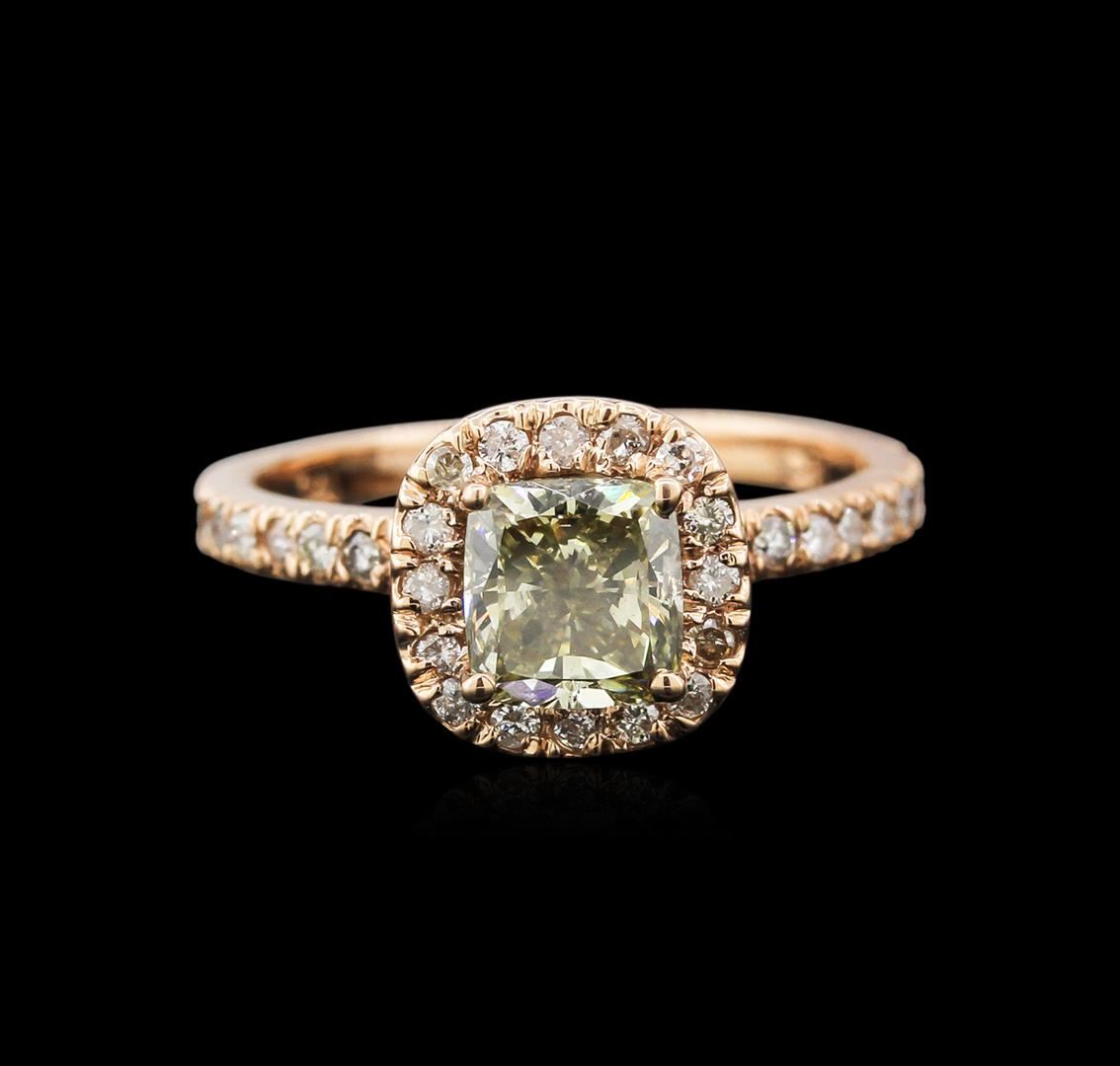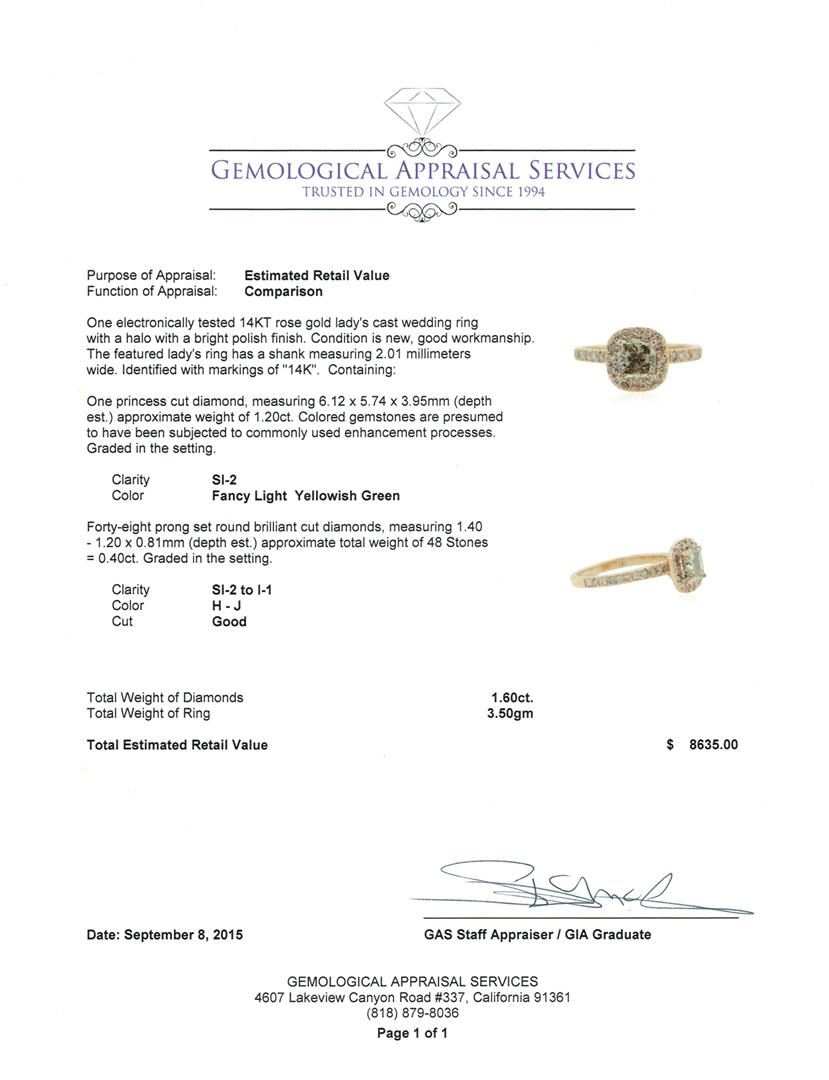 One electronically tested 14KT rose gold lady's cast wedding ring with a halo with a bright polish finish. The featured lady's ring has a shank measuring 2.01 millimeters wide. Identified with markings of "14K". Condition is new, good workmanship. Containing: One princess cut diamond, measuring 6.12 x 5.74 x 3.95mm (depth est.) approximate weight of 1.20ct. Colored gemstones are presumed to have been subjected to commonly used enhancement processes. Graded in the setting. Clarity: SI-2 Forty-Eight prong set round brilliant cut diamonds, measuring 1.40 - 1.20 x 0.81mm (depth est.) approximate total weight of 48 Stones = 0.40ct. Graded in the setting. Clarity: SI-2 to I-1. Color: H - Good. Total Weight of Diamonds 1.60ct. Total Weight of Ring 3.50gm. GAS Appraised at $8,635.00.