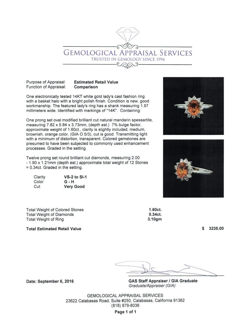 One electronically tested 14KT white gold lady's cast fashion ring with a basket halo with a bright polish finish. The featured lady's ring has a shank measuring 1.97 millimeters wide. Identified with markings of '14K'. Condition is new, good workmanship. Containing: One prong set oval modified brilliant cut natural mandarin spessartite, measuring 7.82 x 5.84 x 3.73mm, (depth est.) 7%. bulge factor, approximate weight of 1.60ct., clarity is slightly included, medium, brownish, orange color, (GIA O 5/3), cut is good. Transmitting light with a minimum of distortion, transparent. Colored gemstones are presumed to have been subjected to commonly used enhancement processes. Graded in the setting. Twelve prong set round brilliant cut diamonds, measuring 2.00 - 1.90 x 1.21mm (depth est.) approximate total weight of 12 Stones = 0.34ct. Graded in the setting. Clarity VS-2 to SI-1. Color: G - H Cut Very Good. Total Weight of Colored Stones 1.60ct.. Total Weight of Diamonds 0.34ct.. Total Weight of Ring 3.10gm GAS Appraised at $3,235.00.