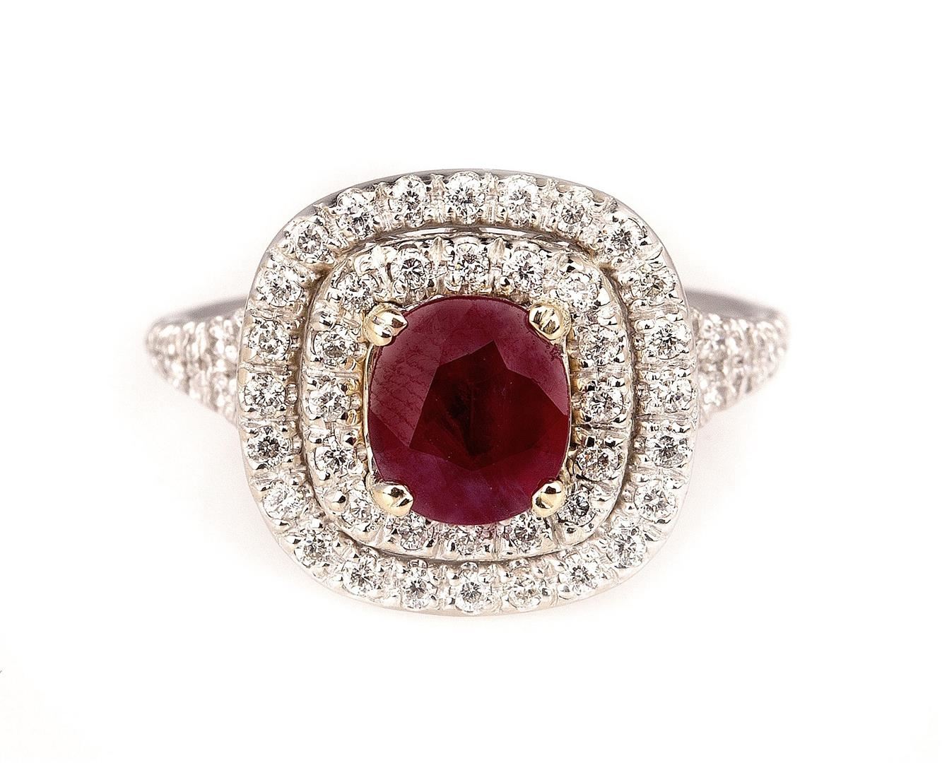 Fourteen karat (14K) two tone gold ruby and diamond ring. An oval cut ruby gemstone is prong mounted in the center of the ring. Round brilliant cut diamonds accent the ring on both sides of the center gemstone. The ring is cast stamped "14K" and has a gross weight of 5.7 Grams. Diamond(s): Shape: Round Brilliant Cut. Weight: 0.52 carat. Average Clarity: SI2-SI3. Average Color: H. Symmetry: Very Good. Polish: Very Good. Fluorescence: None. GemStone(s): GemStone: Ruby Corundum. Nature: Natural. Shape: Oval, Faceted. Quantity: 1, Mounted. Weight: 1.60 carat. Bulge: Visible. Clarity: SI2, Type 3. Color: Red. Symmetry: Very Good. Color Intensity: Medium. Transparency: Translucent. Tone: Medium to Dark. Metal(s): Metal: Gold, Stamped. Purity: 14K. Color: Two Tone. Condition: Excellent. Finish: High polish. GGA Appraised at $18,720.00.