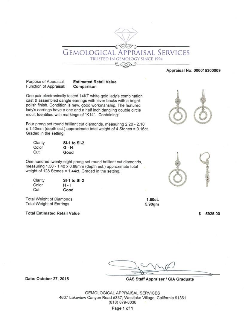 One pair electronically tested 14KT white gold lady's combination cast & assembled dangle earrings with lever backs with a bright polish finish. The featured lady's earrings have a one and a half inch dangling double circle motif. Identified with markings of "K14". Condition is new, good workmanship. Containing: Four prong set round brilliant cut diamonds, measuring 2.20 - 2.10 x 1.40mm (depth est.) approximate total weight of 4 Stones = 0.16ct. Graded in the setting. Clarity: SI-1 to SI-2. Color: G - Good One Hundred Twenty-Eight prong set round brilliant cut diamonds, measuring 1.50 - 1.40 x 0.88mm (depth est.) approximate total weight of 128 Stones = 1.44ct. Graded in the setting. Clarity: SI-1 to SI-2. Color: H - I. Cut Good. Total Weight of Diamonds 1.60ct. Total Weight of Earrings 5.90gm. GAS Appraised at $5,925.00.