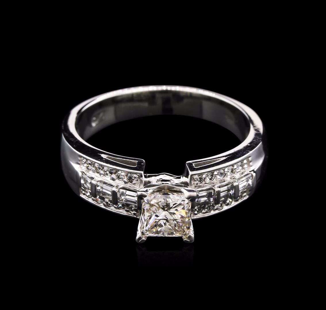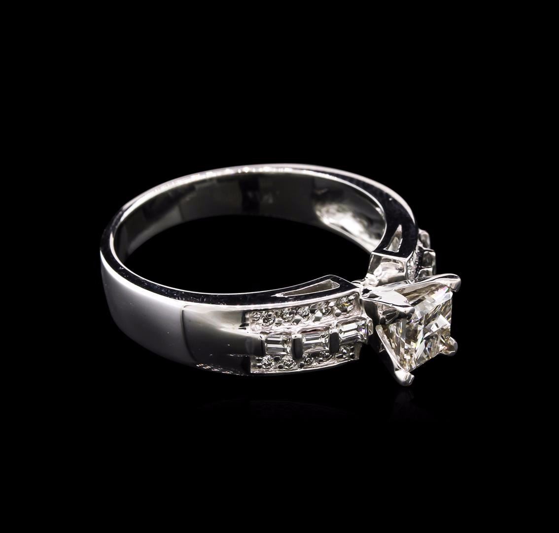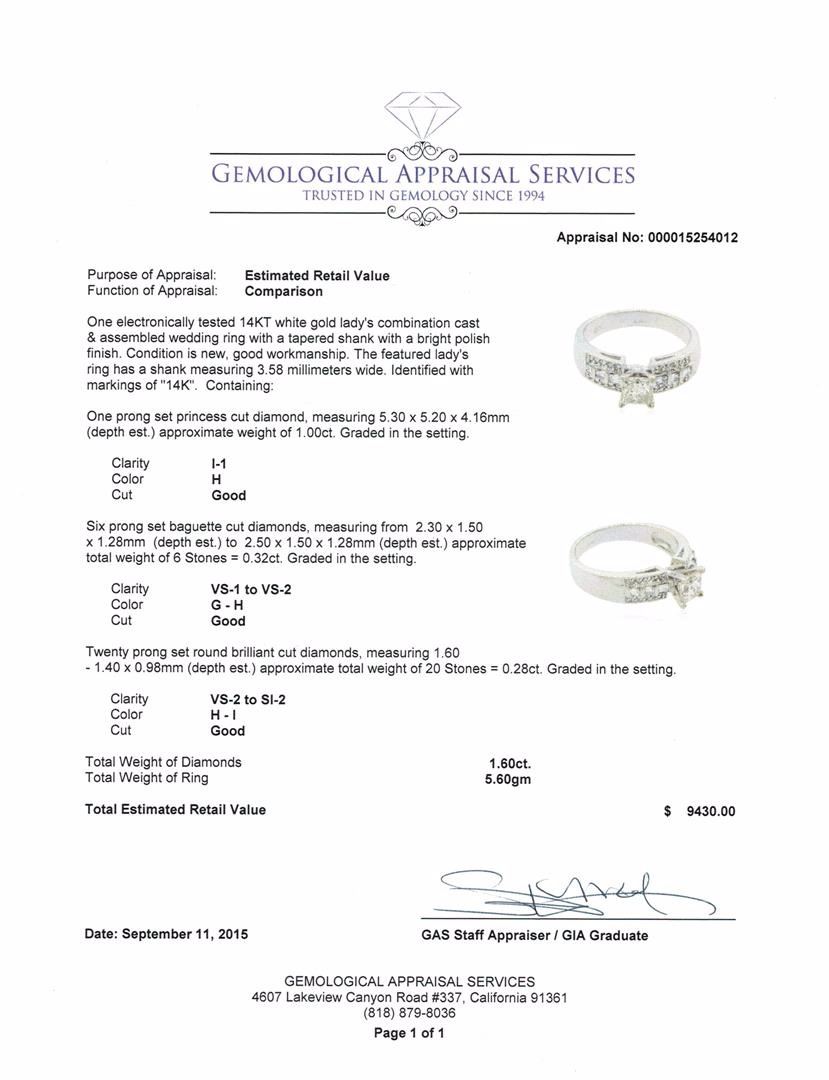 One electronically tested 14KT white gold lady's combination cast & assembled wedding ring with a tapered shank with a bright polish finish. The featured lady's ring has a shank measuring 3.58 millimeters wide. Identified with markings of "14K". Condition is new, good workmanship. Containing: One prong set princess cut diamond, measuring 5.30 x 5.20 x 4.16mm (depth est.) approximate weight of 1.00ct. Graded in the setting. Clarity: I-1. Color: Good Six prong set baguette cut diamonds, measuring from 2.30 x 1.50 x 1.28mm (depth est.) to 2.50 x 1.50 x 1.28mm (depth est.) approximate total weight of 6 Stones = 0.32ct. Graded in the setting. Clarity: VS-1 to VS-2. Color: G - Good Twenty prong set round brilliant cut diamonds, measuring 1.60 - 1.40 x 0.98mm (depth est.) approximate total weight of 20 Stones = 0.28ct. Graded in the setting. Clarity: VS-2 to SI-2. Color: H - I. Cut Good. Total Weight of Diamonds 1.60ct. Total Weight of Ring 5.60gm. GAS Appraised at $9,430.00.