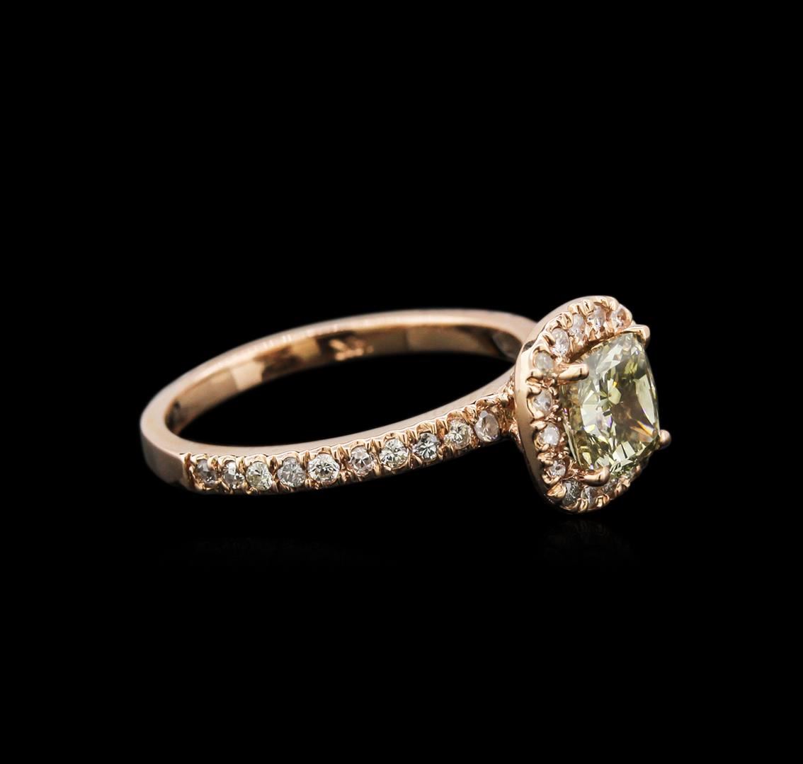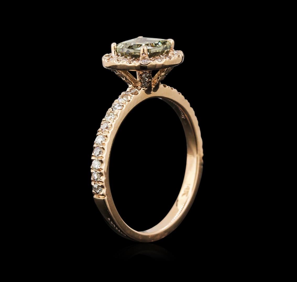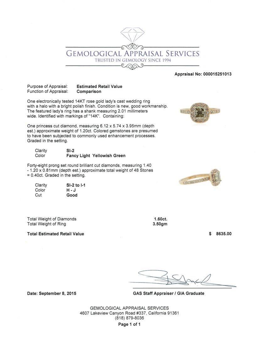 One electronically tested 14KT rose gold lady's cast wedding ring with a halo with a bright polish finish. The featured lady's ring has a shank measuring 2.01 millimeters wide. Identified with markings of "14K". Condition is new, good workmanship. Containing: One princess cut diamond, measuring 6.12 x 5.74 x 3.95mm (depth est.) approximate weight of 1.20ct. Colored gemstones are presumed to have been subjected to commonly used enhancement processes. Graded in the setting. Clarity: SI-2 Forty-Eight prong set round brilliant cut diamonds, measuring 1.40 - 1.20 x 0.81mm (depth est.) approximate total weight of 48 Stones = 0.40ct. Graded in the setting. Clarity: SI-2 to I-1. Color: H - Good. Total Weight of Diamonds 1.60ct. Total Weight of Ring 3.50gm. GAS Appraised at $8,635.00.