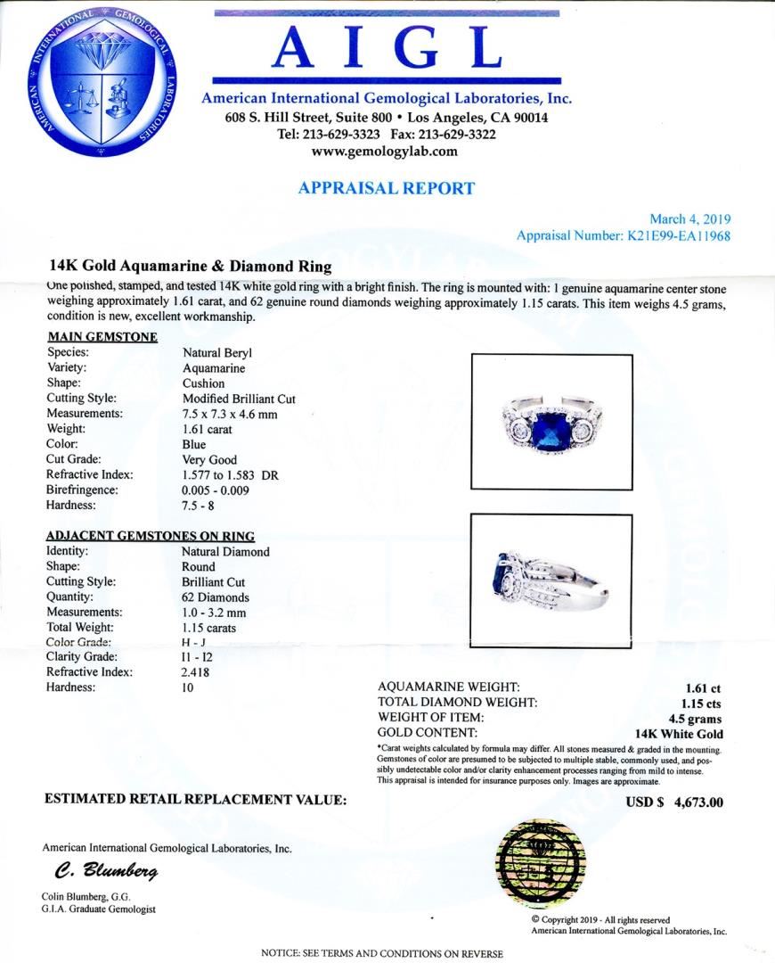 One polished, stamped, and tested 14K white gold ring with a bright finish. The ring is mounted with: 1 genuine aquamarine center stone weighing approximately 1.61 carat, and 62 genuine round diamonds weighing approximately 1.15 carats. This item weighs 4.5 grams, condition is new, excellent workmanship. MAIN GEMSTONE Species: Natural Beryl Variety: Aquamarine Shape: Cushion Cutting Style: Modified Brilliant Cut Measurements: 7.5 x 7.3 x 4.6mm Weight: 1.61 carat Color: Blue Cut Grade: Very Good Refractive Index: 1.577 to 1.583 DR Birefringence: 0.005 - 0.009 Hardness: 7.5 - 8 ADJACENT GEMSTONES ON RING Identity: Natural Diamond Shape: Round Cutting Style: Brilliant Cut Quantity: 62 Diamonds Measurements: 1.0 - 3.2mm Total Weight: 1.15 carats Color Grade: H - J Clarity Grade: I1 to I2 Refractive Index: 2.418 Hardness: 10 AQUAMARINE WEIGHT: 1.61ct TOTAL DIAMOND WEIGHT: 1.15ctw WEIGHT OF ITEM: 4.5 grams GOLD CONTENT: 14K White Gold #LREF-2199