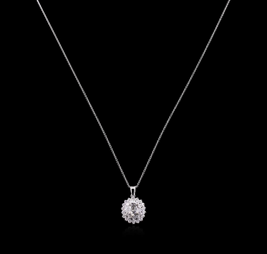 One electronically tested 14KT white gold lady's combination cast & assembled fashion pendant & chain 18.0" long, 1mm round cable link with a spring ring clasp with a basket double halo with a bright polish finish. Identified with markings of "K14". Condition is new, good workmanship. Containing: One prong set oval shaped cut diamond, measuring 7.09 x 5.45 x 3.43mm (depth est.) , 10.00.%. GTCF approximate weight of 0.96ct. Graded in the setting. Clarity: I-1. Color: Good Thirty prong set round brilliant cut diamonds, measuring 1.80 - 1.75 x 1.12mm (depth est.) approximate total weight of 30 Stones = 0.65ct. Graded in the setting. Clarity: SI-1 to I-1. Color: G - I. Cut Good. Total Weight of Diamonds 1.61ct. Total Weight of Pendant & Chain 4.70gm. GAS Appraised at $8,825.00.