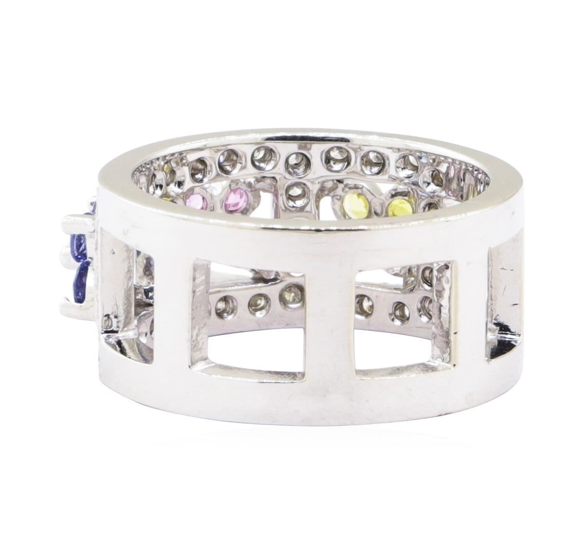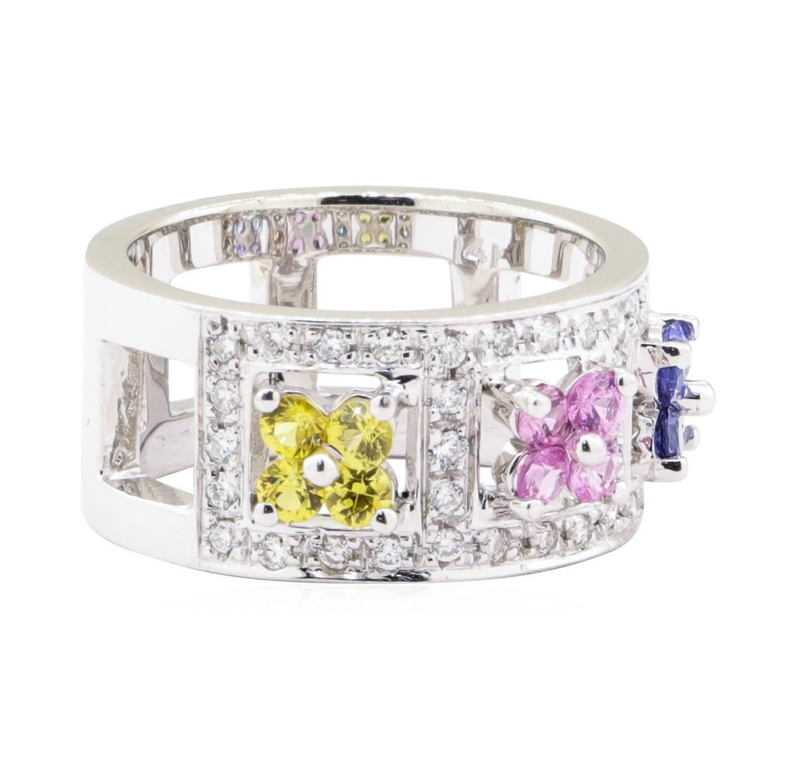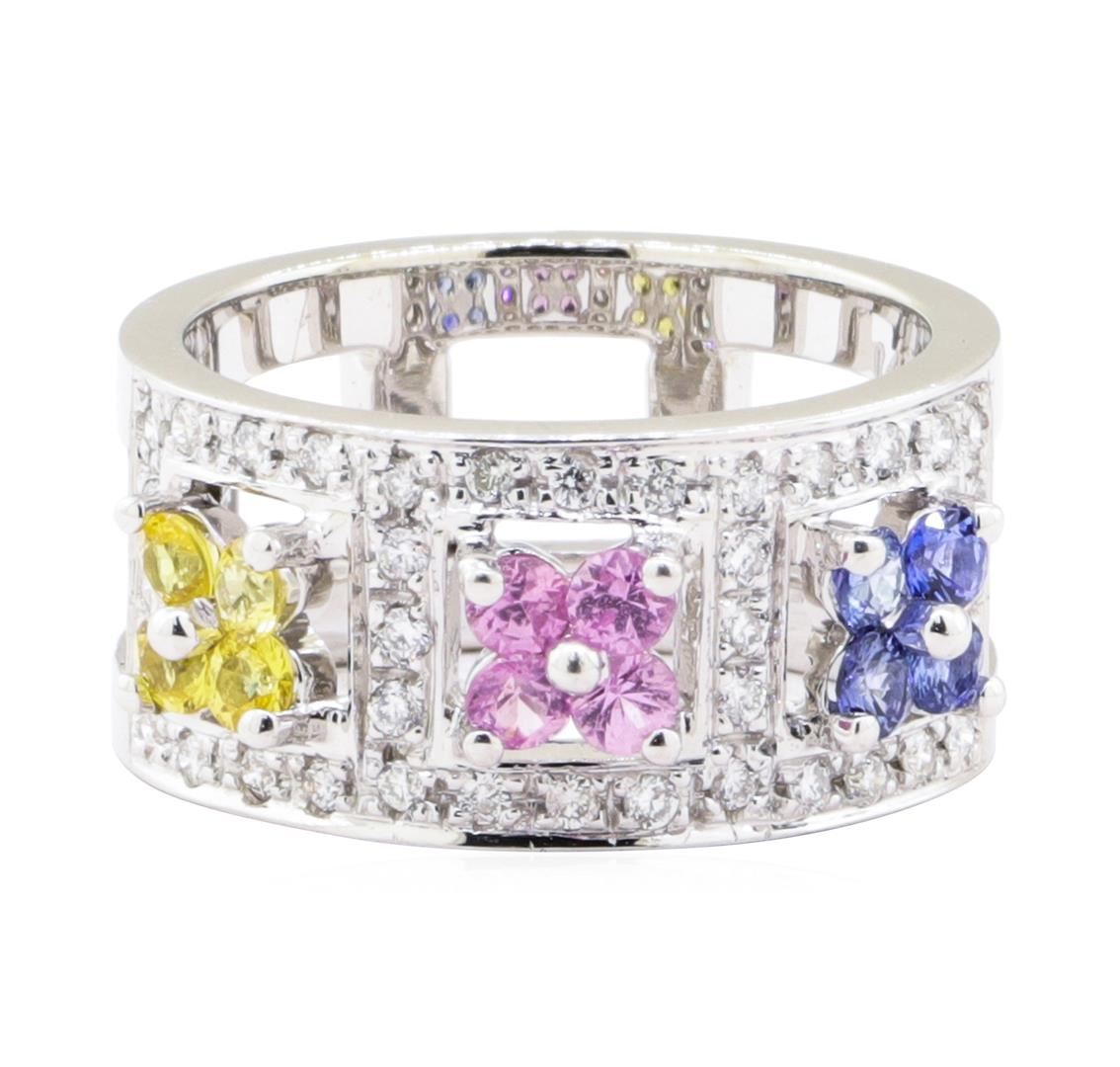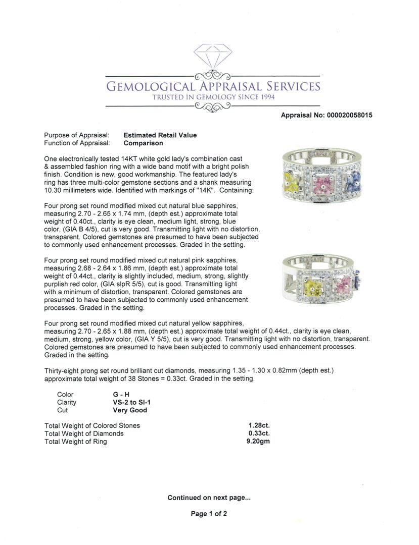 One electronically tested 14KT white gold lady's combination cast & assembled fashion ring with a wide band motif with a bright polish finish. The featured lady's ring has three multi-color gemstone sections and a shank measuring 10.30 millimeters wide. I