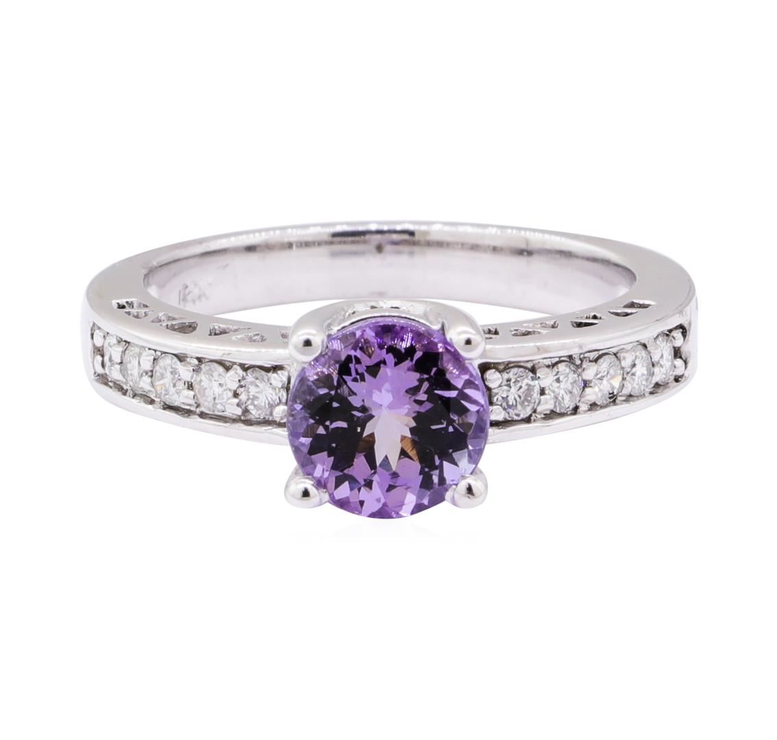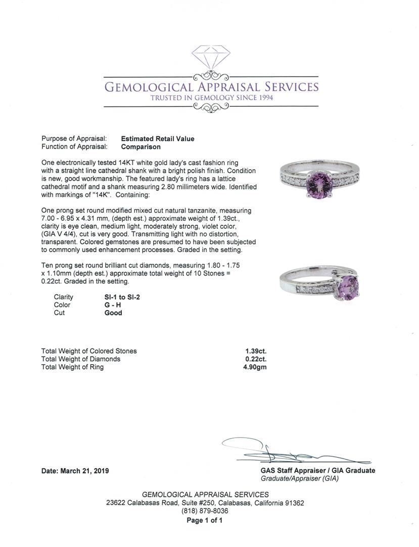 One electronically tested 14KT white gold lady's cast fashion ring with a straight line cathedral shank with a bright polish finish. The featured lady's ring has a lattice cathedral motif and a shank measuring 2.80 millimeters wide. Identified with markings of '14K'. Condition is new, good workmanship. Containing: One prong set round modified mixed cut natural tanzanite, measuring 7.00 - 6.95 x 4.31 mm, (depth est.) approximate weight of 1.39ct., clarity is eye clean, medium light, moderately strong, violet color, (GIA V 4/4), cut is very good. Transmitting light with no distortion, transparent. Colored gemstones are presumed to have been subjected to commonly used enhancement processes. Graded in the setting. Ten prong set round brilliant cut diamonds, measuring 1.80 - 1.75 x 1.10mm (depth est.) approximate total weight of 10 Stones = 0.22ct. Graded in the setting. Color G - H Clarity SI-1 to SI-2 Cut Good. Total Weight of Colored Stones 1.39ct.. Total Weight of Diamonds 0.22ct.. Total Weight of Ring 4.90gm GAS Appraised at $2470.00. GAS Appraised.