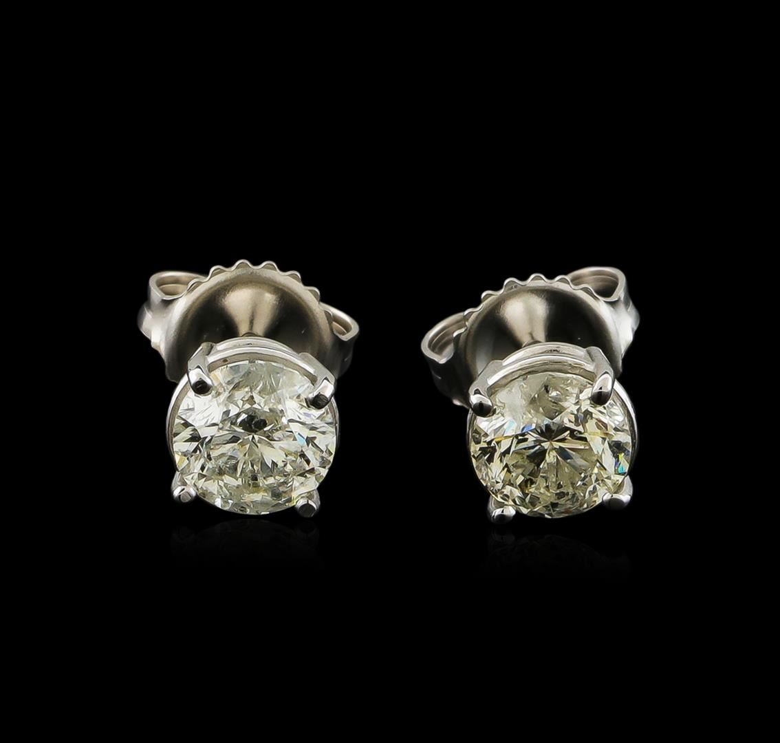 One pair electronically tested 14KT white gold cast & assembled diamond solitaire earrings with standard backs. Bright polish finish. Identified with markings of "14K". Condition is new, good workmanship. Containing: One prong set round brilliant cut diamond, measuring 5.70 - 5.70 x 3.80mm (depth est.) approximate weight of 0.81ct with a medium blue fluorescence. Graded in the setting. Clarity: I-2. Color: I. Depth 66.7%. Table 57.9%. One prong set round brilliant cut diamond, measuring 5.60 - 5.60 x 3.90mm (depth est.) approximate weight of 0.80ct with a strong blue fluorescence. Graded in the setting. Clarity: I-2. Color: J. Depth 69.6%. Table 57.1%. Total Weight of Diamonds 1.61ct. Total Weight of Earrings 1.33gm. AIG Appraised at $6,440.00.