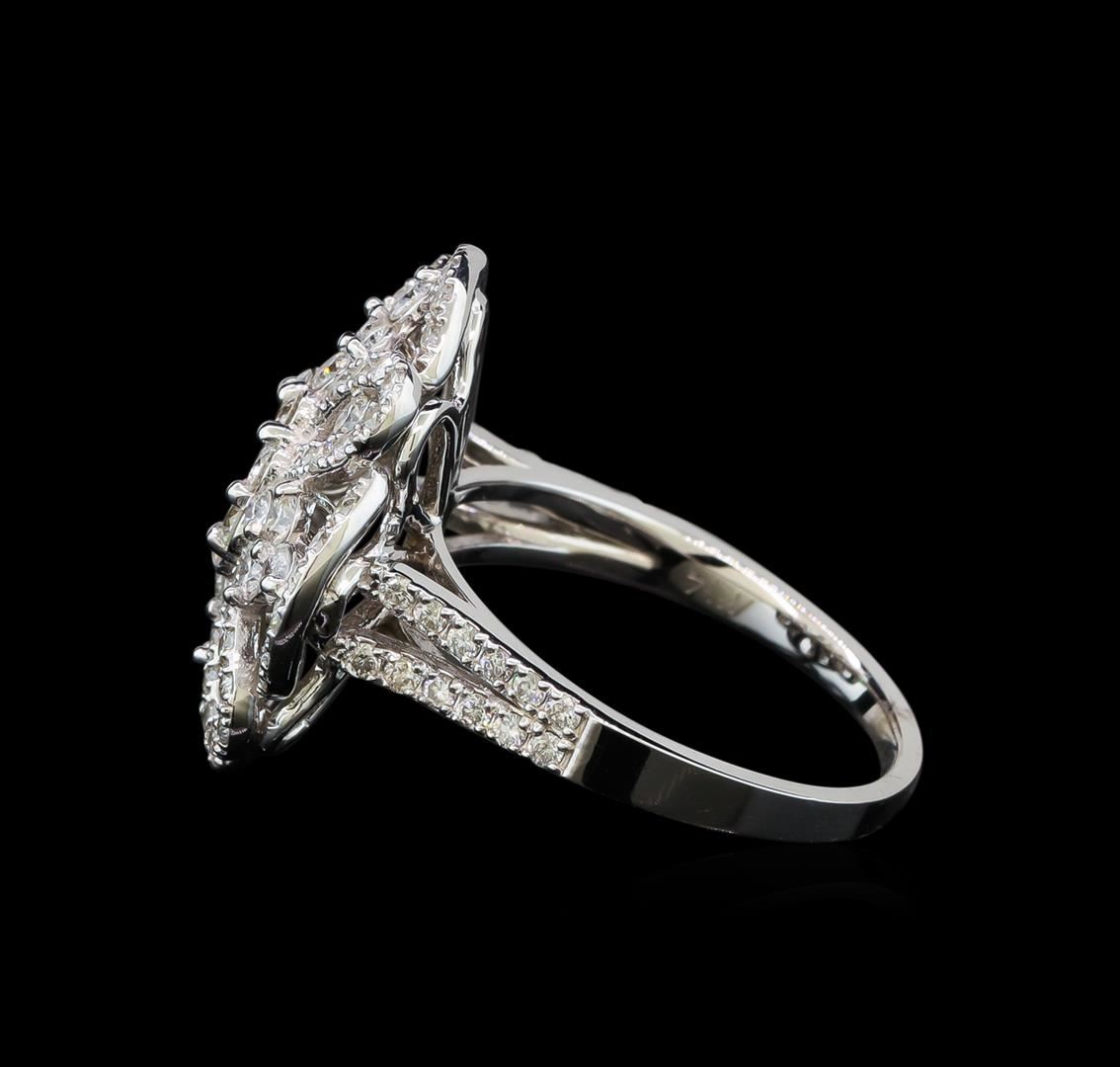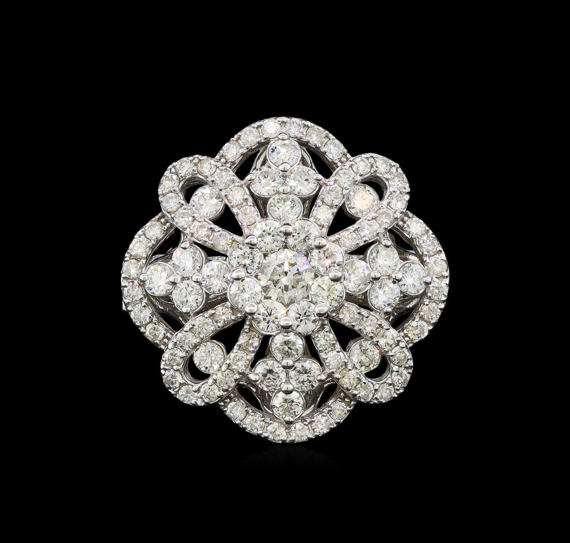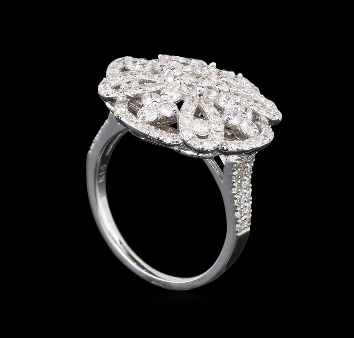 One electronically tested 14KT white gold lady's cast fashion ring with a bright polish finish. The featured lady's ring has a shank measuring 1.57 millimeters wide. Identified with markings of 'K14'. Condition is new, good workmanship. Containing: One prong set round brilliant cut diamond, measuring 3.54 - 3.48 x 2.20mm (depth est.) approximate weight of 0.16ct. Graded in the setting. Clarity I-1. Color: G Cut Very Good Twenty-Eight prong set round brilliant cut diamonds, measuring 2.00 - 1.90 x 1.21mm (depth est.) approximate total weight of 28 Stones = 0.78ct. Graded in the setting. Clarity SI-1 to I-1. Color: G - I Cut Good Eighty-Eight prong set round brilliant cut diamonds, measuring 1.30 - 1.25 x 0.79mm (depth est.) approximate total weight of 88 Stones = 0.68ct. Graded in the setting. Clarity SI-1 to I-1. Color: G - I Cut Good. Total Weight of Diamonds 1.62ct.. Total Weight of Ring 5.90gm. GAS Appraised at $5,360.00.