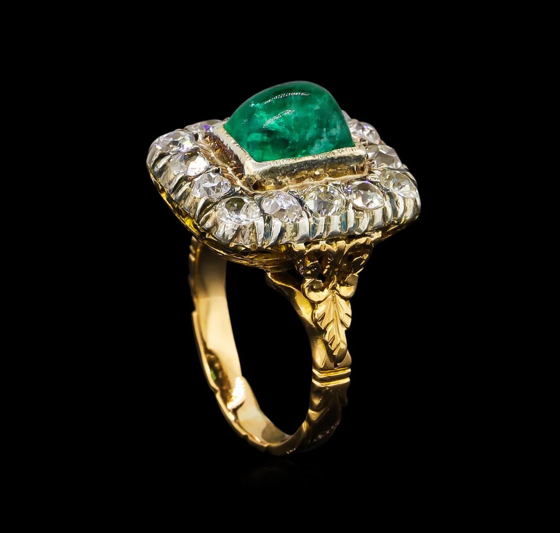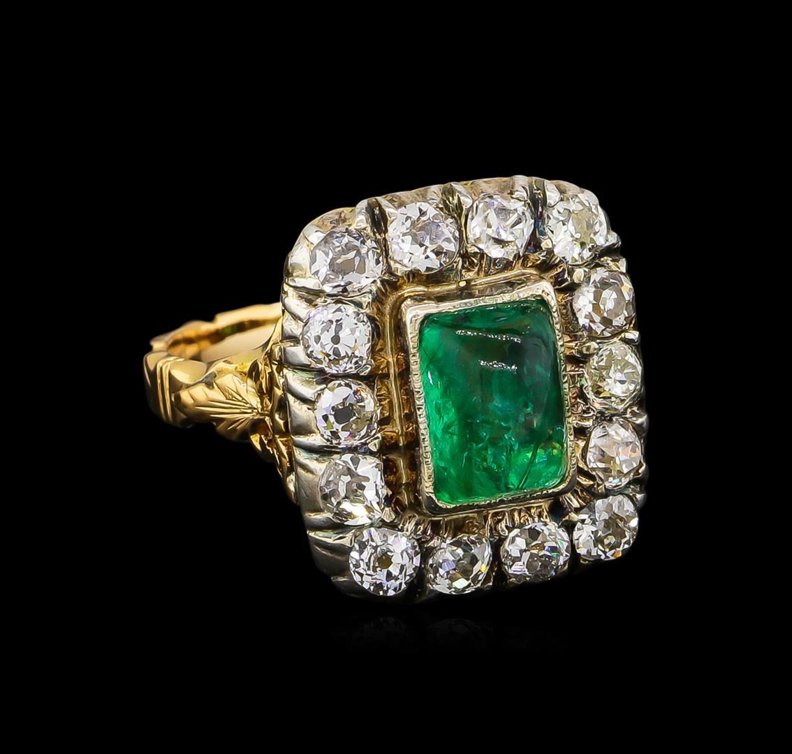 One electronically tested 18KT yellow gold ladies cast emerald and diamond ring. The featured emerald is set within a diamond bezel supported by an elaborate engraved under gallery and intricately engraved shoulders, completed by a two millimeter wide band. Bright polish and patterned finish with rhodium accents. Condition is good. Containing: One bezel set rectangular cabochon cut natural emerald, measuring 7.70 x 5.10 x 5.60mm, approximate weight of 1.62ct., clarity is moderately included, type III, medium, very slightly grayish, green color, (GIA G 5/3), cut is good. Transmitting light with a minimum of distortion, transparent. Naturally occurring internal & external characteristics are present. Indications of oil residue. Graded in the setting. Fourteen prong set Old European cut diamonds, measuring 2.80 - 2.60 x 1.70mm (depth est.) approximate total weight of 14 Stones = 1.15ct. Cutting style circa mid 19th century. Graded in the setting. Clarity: SI-1 to I-1. Color: G - I. Total Weight of Colored Stones 1.62ct. Total Weight of Diamonds 1.15ct. Total Weight of Ring 5.36gm. AIG Appraised at $5,340.00.