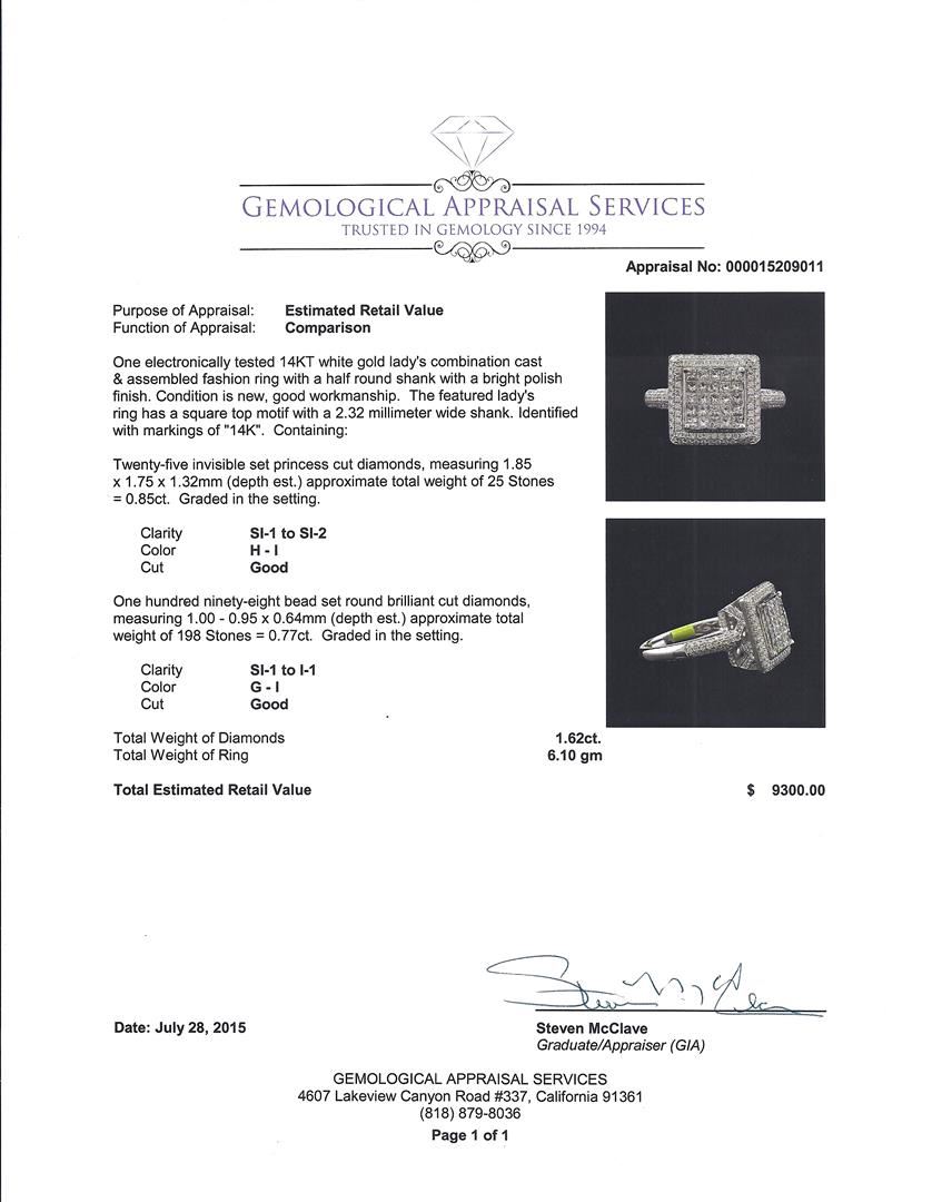 One electronically tested 14KT white gold lady's combination cast & assembled fashion ring with a half round shank with a bright polish finish. The featured lady's ring has a square top motif with a 2.32 millimeter wide shank. Identified with markings of "14K". Condition is new, good workmanship. Containing: Twenty-Five invisible set princess cut diamonds, measuring 1.85 x 1.75 x 1.32mm (depth est.) approximate. Total Weight of 25 Stones = 0.85ct. Graded in the setting. Clarity: SI-1 to SI-2. Color: H - I. Cut Good One Hundred Ninety-Eight bead set round brilliant cut diamonds, measuring 1.00 - 0.95 x 0.64mm (depth est.) approximate. Total Weight of 198 Stones = 0.77ct. Graded in the setting. Clarity: SI-1 to I-1. Color: G - I. Cut Good. Total Weight of Diamonds 1.62ct. Total Weight of Ring 6.10gm. GAS Appraised at $9,300.00.