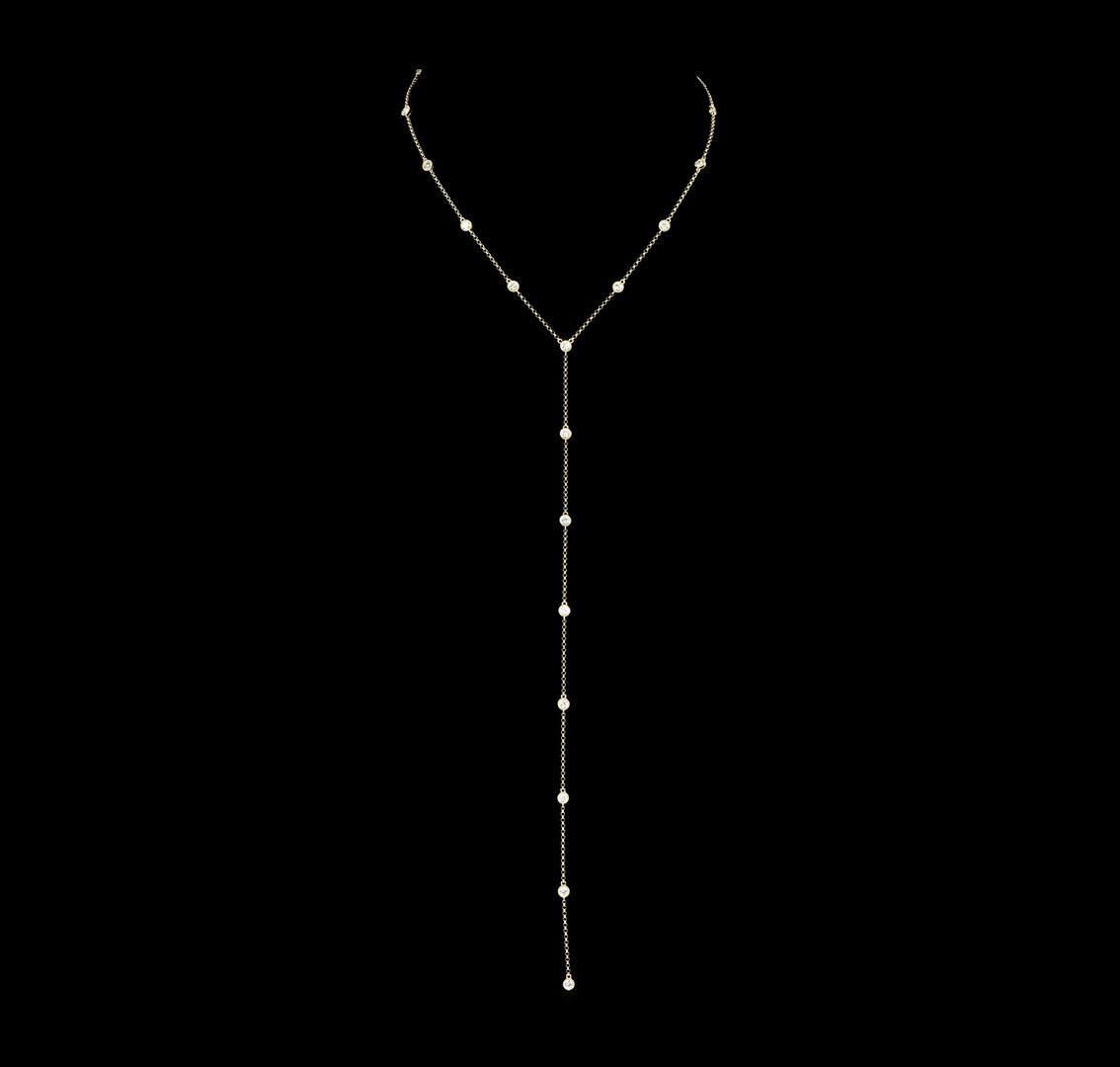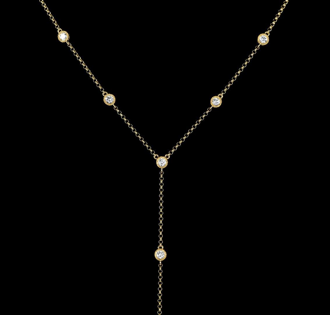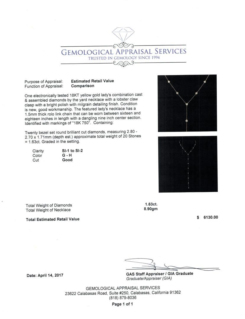 One electronically tested 18KT yellow gold lady's combination cast & assembled diamonds by the yard necklace with a lobster claw clasp with a bright polish with milgrain detailing finish. The featured lady's necklace has a 1.5mm thick rolo link chain that can be worn between sixteen and eighteen inches in length with a dangling nine inch center section. Identified with markings of '18K 750'. Condition is new, good workmanship. Containing: Twenty bezel set round brilliant cut diamonds, measuring 2.80 - 2.70 x 1.71mm (depth est.) approximate total weight of 20 Stones = 1.63ct. Graded in the setting. Color G - H Clarity SI-1 to SI-2 Cut Good. Total Weight of Diamonds 1.63ct.. Total Weight of Necklace 8.90gm GAS Appraised at $6130.00. GAS Appraised at $6,130.00.