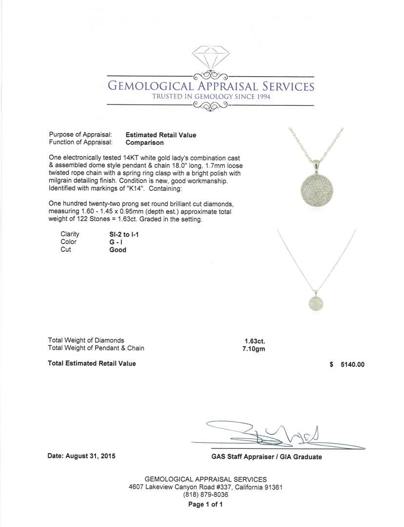One electronically tested 14KT white gold lady's combination cast & assembled dome style pendant & chain 18.0" long, 1.7mm loose twisted rope chain with a spring ring clasp with a bright polish with milgrain detailing finish. Identified with markings of "K14". Condition is new, good workmanship. Containing: One Hundred Twenty-Two prong set round brilliant cut diamonds, measuring 1.60 - 1.45 x 0.95mm (depth est.) approximate total weight of 122 Stones = 1.63ct. Graded in the setting. Clarity: SI-2 to I-1. Color: G - I. Cut Good. Total Weight of Diamonds 1.63ct. Total Weight of Pendant & Chain 7.10gm. GAS Appraised at $5,140.00.