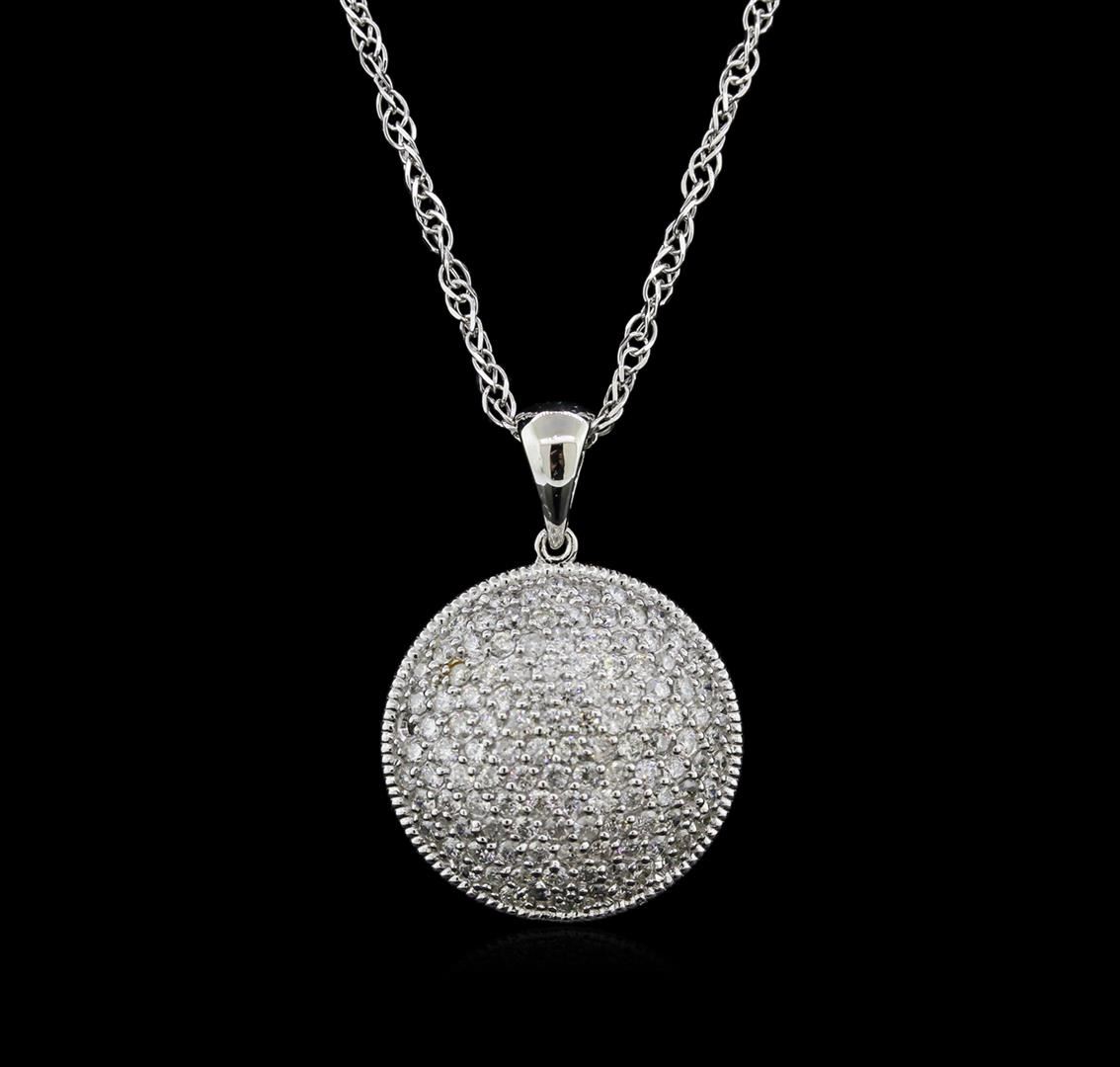 One electronically tested 14KT white gold lady's combination cast & assembled dome style pendant & chain 18.0" long, 1.7mm loose twisted rope chain with a spring ring clasp with a bright polish with milgrain detailing finish. Identified with markings of "K14". Condition is new, good workmanship. Containing: One Hundred Twenty-Two prong set round brilliant cut diamonds, measuring 1.60 - 1.45 x 0.95mm (depth est.) approximate total weight of 122 Stones = 1.63ct. Graded in the setting. Clarity: SI-2 to I-1. Color: G - I. Cut Good. Total Weight of Diamonds 1.63ct. Total Weight of Pendant & Chain 7.10gm. GAS Appraised at $5,140.00.