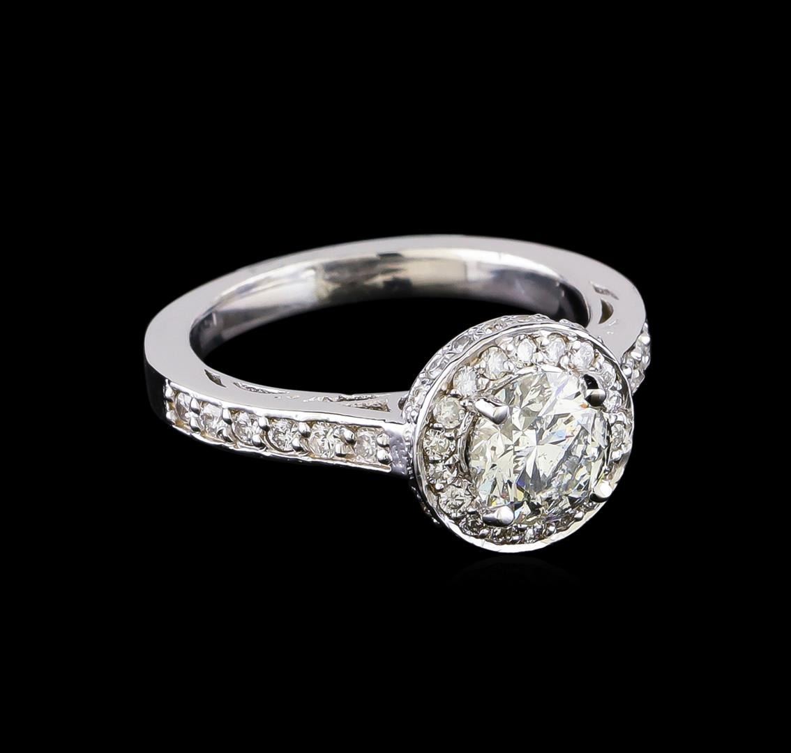 One electronically tested 14KT white gold lady's cast wedding ring with a halo with a bright polish finish. The featured lady's ring has a shank measuring 2.28 millimeters in width. Identified with markings of "14K". Condition is new, good workmanship. Containing: One prong set round brilliant cut diamond, measuring 6.50 - 6.46 x 4.20mm (depth est.) approximate weight of 1.09ct. Graded in the setting. Clarity: I-1. Color: J - K. Cut Very Good Fourteen prong set round brilliant cut diamonds, measuring 1.50 - 1.45 x 0.92mm (depth est.) approximate total weight of 14 Stones = 0.20ct. Graded in the setting. Clarity: SI-1 to SI-2. Color: H - I. Cut Good Thirty-Four prong set round brilliant cut diamonds, measuring 1.40 - 1.35 x 0.86mm (depth est.) approximate total weight of 34 Stones = 0.34ct. Graded in the setting. Clarity: SI-1 to SI-2. Color: H - I. Cut Good. Total Weight of Diamonds 1.63ct. Total Weight of Ring 5.00gm GAS Appraised at $10,550.00.
