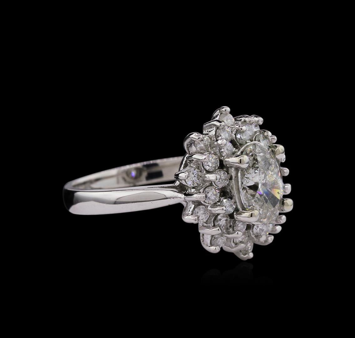 One electronically tested 14KT white gold lady's cast fashion ring with a triple basket halo with a bright polish finish. The featured lady's ring has a shank measuring 2.40 millimeters wide. Identified with markings of "K14". Condition is new, good workmanship. Containing: One prong set oval shaped cut diamond, measuring 7.93 x 5.30 x 3.50mm (depth est.) , 5.00.%. GTCF approximate weight of 1.03ct. Graded in the setting. Clarity: I-1. Color: I. Cut Good Thirty prong set round brilliant cut diamonds, measuring 1.90 - 1.70 x 1.08mm (depth est.) approximate total weight of 30 Stones = 0.60ct. Graded in the setting. Clarity: SI-1 to I-1. Color: G - I. Cut Good. Total Weight of Diamonds 1.63ct. Total Weight of Ring 4.80gm. GAS Appraised at $10,340.00.