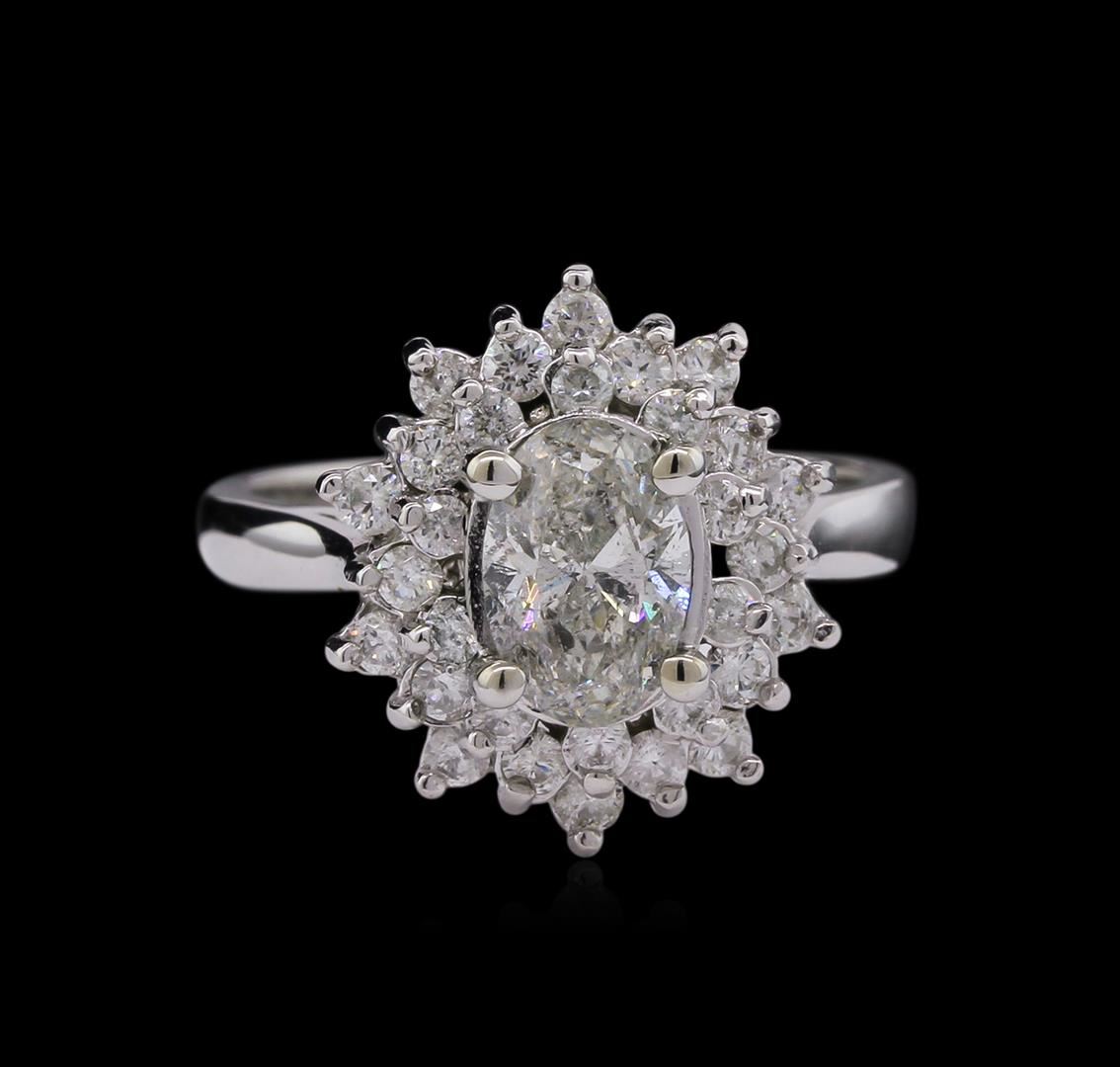 One electronically tested 14KT white gold lady's cast fashion ring with a triple basket halo with a bright polish finish. The featured lady's ring has a shank measuring 2.40 millimeters wide. Identified with markings of "K14". Condition is new, good workmanship. Containing: One prong set oval shaped cut diamond, measuring 7.93 x 5.30 x 3.50mm (depth est.) , 5.00.%. GTCF approximate weight of 1.03ct. Graded in the setting. Clarity: I-1. Color: I. Cut Good Thirty prong set round brilliant cut diamonds, measuring 1.90 - 1.70 x 1.08mm (depth est.) approximate total weight of 30 Stones = 0.60ct. Graded in the setting. Clarity: SI-1 to I-1. Color: G - I. Cut Good. Total Weight of Diamonds 1.63ct. Total Weight of Ring 4.80gm. GAS Appraised at $10,340.00.