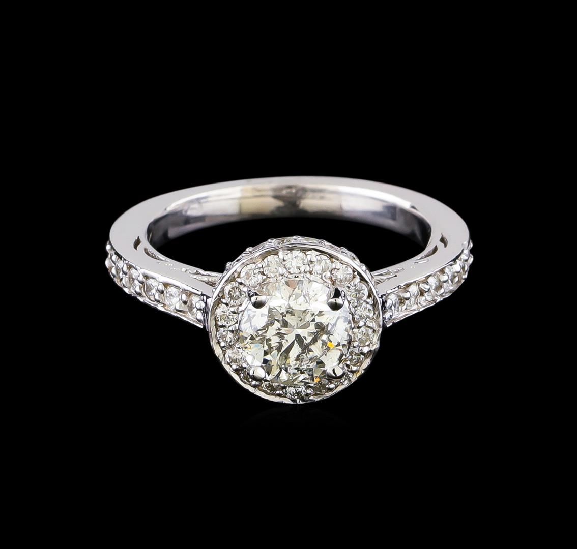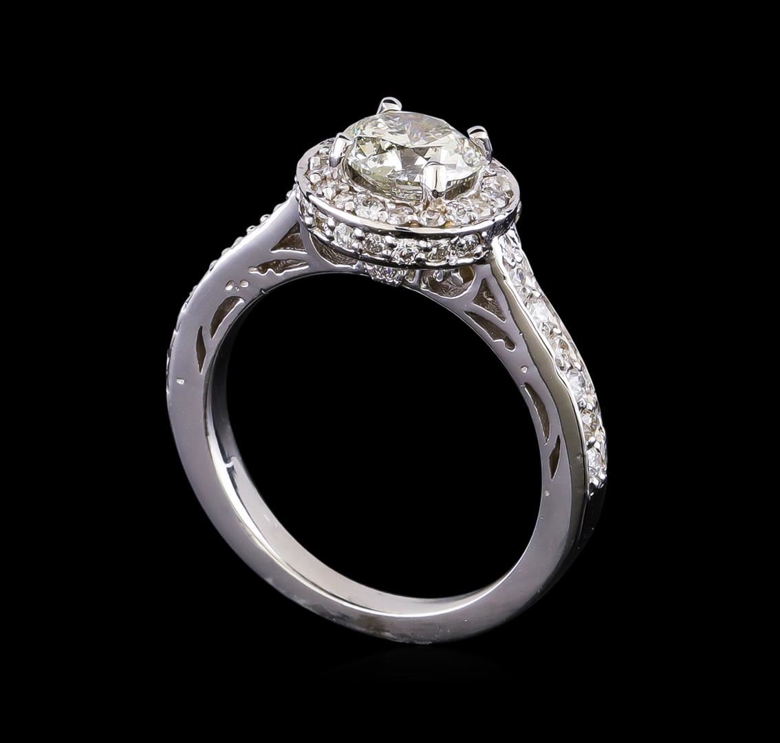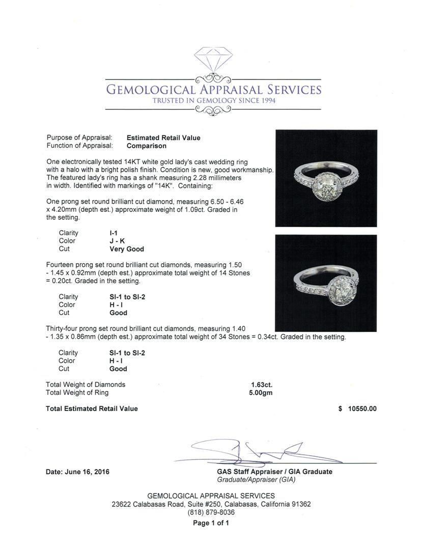 One electronically tested 14KT white gold lady's cast wedding ring with a halo with a bright polish finish. The featured lady's ring has a shank measuring 2.28 millimeters in width. Identified with markings of "14K". Condition is new, good workmanship. Containing: One prong set round brilliant cut diamond, measuring 6.50 - 6.46 x 4.20mm (depth est.) approximate weight of 1.09ct. Graded in the setting. Clarity: I-1. Color: J - K. Cut Very Good Fourteen prong set round brilliant cut diamonds, measuring 1.50 - 1.45 x 0.92mm (depth est.) approximate total weight of 14 Stones = 0.20ct. Graded in the setting. Clarity: SI-1 to SI-2. Color: H - I. Cut Good Thirty-Four prong set round brilliant cut diamonds, measuring 1.40 - 1.35 x 0.86mm (depth est.) approximate total weight of 34 Stones = 0.34ct. Graded in the setting. Clarity: SI-1 to SI-2. Color: H - I. Cut Good. Total Weight of Diamonds 1.63ct. Total Weight of Ring 5.00gm GAS Appraised at $10,550.00.
