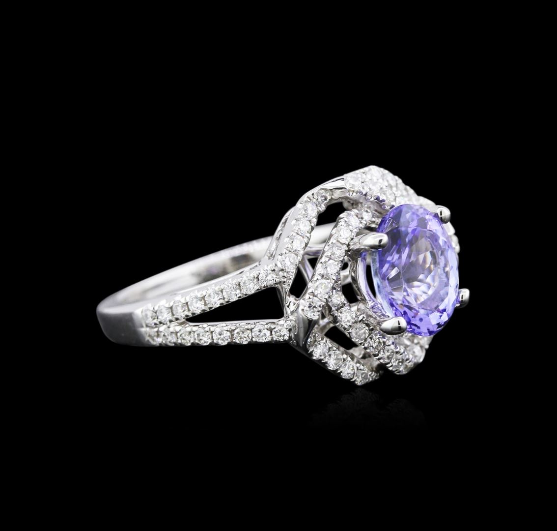 One electronically tested 18KT white gold ladies cast tanzanite and diamond ring with a bright polish finish. Identified with markings of "K18". Condition is new. Containing: One prong set oval modified brilliant cut natural tanzanite, measuring 8.49 x 6.48 x 4.21mm, approximate weight of 1.63ct., clarity is eye clean, type I, medium light, very slightly grayish, violet color, (GIA V 4/3), cut is good. Eighty prong set round brilliant cut diamonds, measuring 1.20 - 1.20 x 0.72mm (depth est.) approximate total weight of 80 Stones = 0.55ct. Clarity: SI-1 to SI-2. Color: H - I, Cut is Good. Colored gemstones are presumed to have been subjected to commonly used enhancement processes. All diamonds and colored gemstones are graded in the mounting, unless otherwise stated. Total Weight of Colored Stones 1.63ct. Total Weight of Diamonds 0.55ct. Total Weight of Ring 6.10 grams. GGL Appraised at $3,130.00.