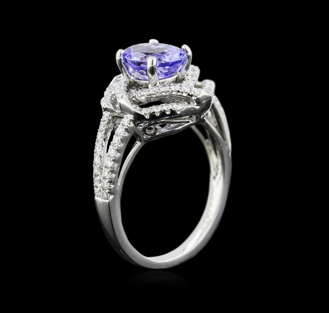 One electronically tested 18KT white gold ladies cast tanzanite and diamond ring with a bright polish finish. Identified with markings of "K18". Condition is new. Containing: One prong set oval modified brilliant cut natural tanzanite, measuring 8.49 x 6.48 x 4.21mm, approximate weight of 1.63ct., clarity is eye clean, type I, medium light, very slightly grayish, violet color, (GIA V 4/3), cut is good. Eighty prong set round brilliant cut diamonds, measuring 1.20 - 1.20 x 0.72mm (depth est.) approximate total weight of 80 Stones = 0.55ct. Clarity: SI-1 to SI-2. Color: H - I, Cut is Good. Colored gemstones are presumed to have been subjected to commonly used enhancement processes. All diamonds and colored gemstones are graded in the mounting, unless otherwise stated. Total Weight of Colored Stones 1.63ct. Total Weight of Diamonds 0.55ct. Total Weight of Ring 6.10 grams. GGL Appraised at $3,130.00.