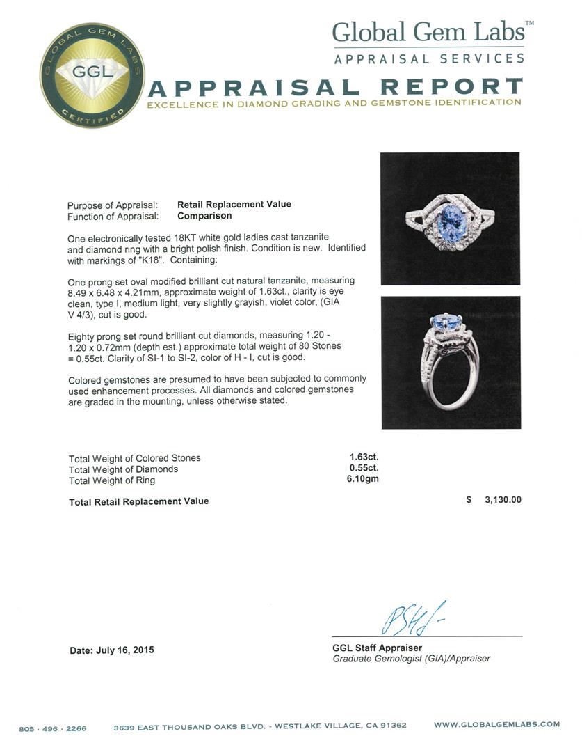 One electronically tested 18KT white gold ladies cast tanzanite and diamond ring with a bright polish finish. Identified with markings of "K18". Condition is new. Containing: One prong set oval modified brilliant cut natural tanzanite, measuring 8.49 x 6.48 x 4.21mm, approximate weight of 1.63ct., clarity is eye clean, type I, medium light, very slightly grayish, violet color, (GIA V 4/3), cut is good. Eighty prong set round brilliant cut diamonds, measuring 1.20 - 1.20 x 0.72mm (depth est.) approximate total weight of 80 Stones = 0.55ct. Clarity: SI-1 to SI-2. Color: H - I, Cut is Good. Colored gemstones are presumed to have been subjected to commonly used enhancement processes. All diamonds and colored gemstones are graded in the mounting, unless otherwise stated. Total Weight of Colored Stones 1.63ct. Total Weight of Diamonds 0.55ct. Total Weight of Ring 6.10 grams. GGL Appraised at $3,130.00.