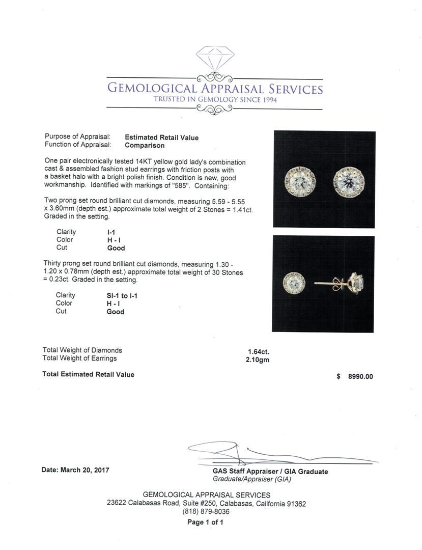 One pair electronically tested 14KT yellow gold lady's combination cast & assembled fashion stud earrings with friction posts with a basket halo with a bright polish finish. Identified with markings of '585'. Condition is new, good workmanship. Containing: Two prong set round brilliant cut diamonds, measuring 5.59 - 5.55 x 3.60mm (depth est.) approximate total weight of 2 Stones = 1.41ct. Graded in the setting. Color H - I Clarity I-1 Cut Good Thirty prong set round brilliant cut diamonds, measuring 1.30 - 1.20 x 0.78mm (depth est.) approximate total weight of 30 Stones = 0.23ct. Graded in the setting. Color H - I Clarity SI-1 to I-1 Cut Good. Total Weight of Diamonds 1.64ct.. Total Weight of Earrings 2.10gm GAS Appraised at $8,990.00.