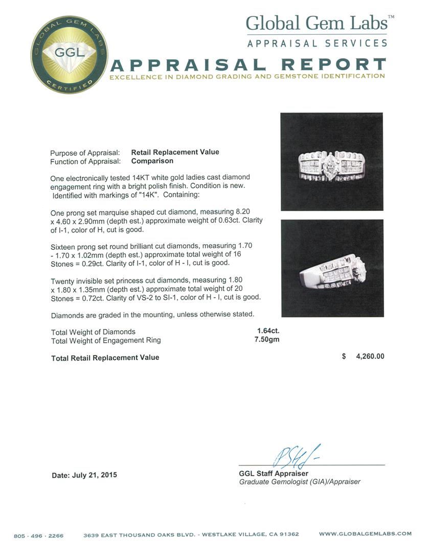 One electronically tested 14KT white gold ladies cast diamond engagement ring with a bright polish finish. Identified with markings of "14K". Condition is new. Containing: One prong set marquise shaped cut diamond, measuring 8.20 x 4.60 x 2.90mm (depth est.) approximate weight of 0.63ct. Clarity: I-1. Color: H, Cut is Good. Sixteen prong set round brilliant cut diamonds, measuring 1.70 - 1.70 x 1.02mm (depth est.) approximate total weight of 16 Stones = 0.29ct. Clarity: I-1. Color: H - I, Cut is Good. Twenty invisible set princess cut diamonds, measuring 1.80 x 1.80 x 1.35mm (depth est.) approximate total weight of 20 Stones = 0.72ct. Clarity: VS-2 to SI-1. Color: H - I, Cut is Good. Diamonds are graded in the mounting, unless otherwise stated. Total Weight of Diamonds 1.64ct. Total Weight of Engagement Ring 7.50gm. GGL Appraised at $4,260.00.