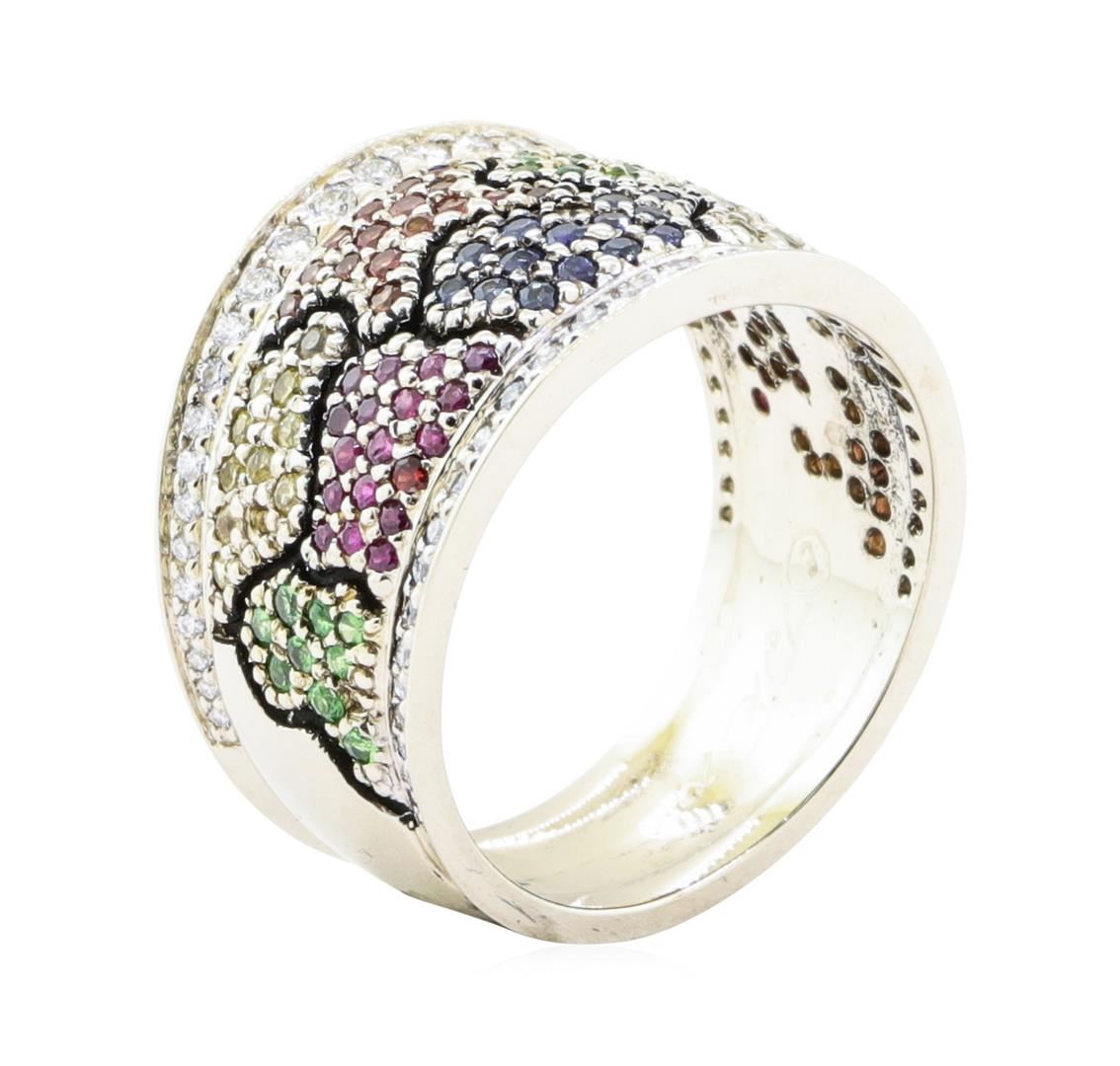 One electronically tested 18KT yellow and white gold lady's combination cast & assembled fashion designer wide band with a tapered shank with a bright polish finish. The featured lady's ring has a mixed color Lily Pad motif separated by black enamel, with diamond borders, and has a shank measuring 8.30 millimeters in width. Trademark is Tolle 2010. Condition is new, good workmanship. Containing: Fifteen prong set round modified brilliant cut natural blue sapphires, measuring 1.35 - 1.30 x 0.86 mm, (depth est.) approximate total weight of 0.15ct., clarity is eye clean, medium, strong, blue color, (GIA B 5/5), cut is very good. Colored gemstones are presumed to have been subjected to commonly used enhancement processes. Transmitting light with no distortion, transparent. Graded in the setting. Twenty-four prong set round modified brilliant cut natural yellow sapphires, measuring 1.30 - 1.25 x 0.83 mm, (depth est.) approximate total weight of 0.24ct., clarity is eye clean, medium, strong, yellow color, (GIA Y 5/5), cut is very good. Colored gemstones are presumed to have been subjected to commonly used enhancement processes. Transmitting light with no distortion, transparent. Graded in the setting. Twenty-seven prong set round modified brilliant cut natural orange sapphires, measuring 1.30 - 1.25 x 0.83 mm, (depth est.) approximate total weight of 0.27ct., clarity is eye clean, medium, strong, reddish orange color, (GIA rO 5/5), cut is very good. Colored gemstones are presumed to have been subjected to commonly used enhancement processes. Transmitting light with no distortion, transparent. Graded in the setting. Thirty-two prong set round modified brilliant cut natural pink sapphires, measuring 1.30 - 1.25 x 0.83 mm, (depth est.) approximate total weight of 0.32ct., clarity is eye clean, medium light, strong, strongly purplish red color, (GIA stpR 4/5), cut is very good. Colored gemstones are presumed to have been subjected to commonly used enhancement processes. Transmitting light with no distortion, transparent. Graded in the setting. Twenty-six prong set round modified brilliant cut natural tsavorite garnets, measuring 1.35 - 1.25 x 0.85 mm, (depth est.) approximate total weight of 0.26ct., clarity is eye clean, medium, strong, slightly yellowish green color, (GIA slyG 5/5), cut is very good. Colored gemstones are presumed to have been subjected to commonly used enhancement processes. Transmitting light with no distortion, transparent. Graded in the setting. Sixty prong set round brilliant cut diamonds, measuring 1.40 - 1.00 x 0.74mm (depth est.) approximate total weight of 60 Stones = 0.40 ct. Graded in the setting. Color F - G Clarity VVS-2 to VS-2 Cut Excellent. Total Weight of Colored Stones 1.24ct.. Total Weight of Diamonds 0.40 ct.. Total Weight of Wide Band 8.90gm GAS Appraised at $3600.00. GAS Appraised.