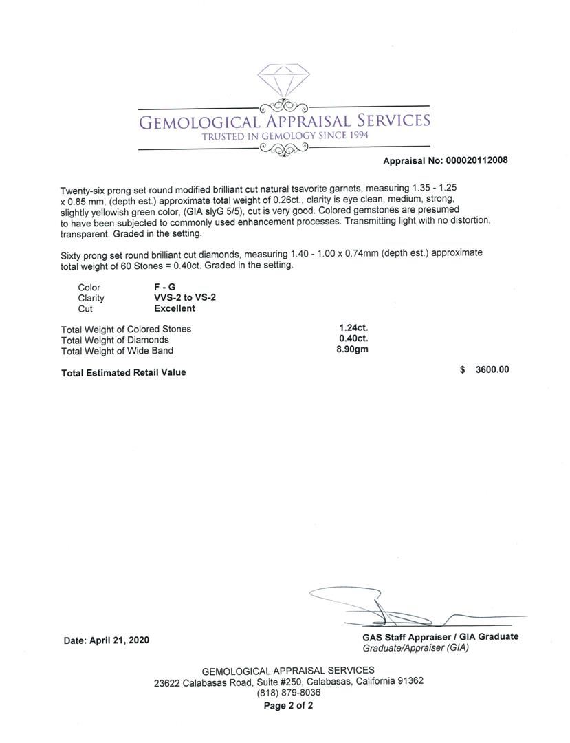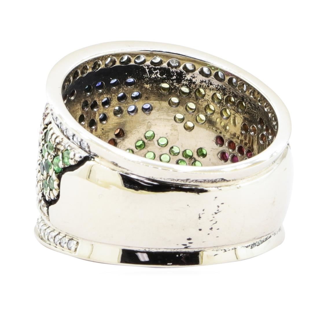 One electronically tested 18KT yellow and white gold lady's combination cast & assembled fashion designer wide band with a tapered shank with a bright polish finish. The featured lady's ring has a mixed color Lily Pad motif separated by black enamel, with diamond borders, and has a shank measuring 8.30 millimeters in width. Trademark is Tolle 2010. Condition is new, good workmanship. Containing: Fifteen prong set round modified brilliant cut natural blue sapphires, measuring 1.35 - 1.30 x 0.86 mm, (depth est.) approximate total weight of 0.15ct., clarity is eye clean, medium, strong, blue color, (GIA B 5/5), cut is very good. Colored gemstones are presumed to have been subjected to commonly used enhancement processes. Transmitting light with no distortion, transparent. Graded in the setting. Twenty-four prong set round modified brilliant cut natural yellow sapphires, measuring 1.30 - 1.25 x 0.83 mm, (depth est.) approximate total weight of 0.24ct., clarity is eye clean, medium, strong, yellow color, (GIA Y 5/5), cut is very good. Colored gemstones are presumed to have been subjected to commonly used enhancement processes. Transmitting light with no distortion, transparent. Graded in the setting. Twenty-seven prong set round modified brilliant cut natural orange sapphires, measuring 1.30 - 1.25 x 0.83 mm, (depth est.) approximate total weight of 0.27ct., clarity is eye clean, medium, strong, reddish orange color, (GIA rO 5/5), cut is very good. Colored gemstones are presumed to have been subjected to commonly used enhancement processes. Transmitting light with no distortion, transparent. Graded in the setting. Thirty-two prong set round modified brilliant cut natural pink sapphires, measuring 1.30 - 1.25 x 0.83 mm, (depth est.) approximate total weight of 0.32ct., clarity is eye clean, medium light, strong, strongly purplish red color, (GIA stpR 4/5), cut is very good. Colored gemstones are presumed to have been subjected to commonly used enhancement processes. Transmitting light with no distortion, transparent. Graded in the setting. Twenty-six prong set round modified brilliant cut natural tsavorite garnets, measuring 1.35 - 1.25 x 0.85 mm, (depth est.) approximate total weight of 0.26ct., clarity is eye clean, medium, strong, slightly yellowish green color, (GIA slyG 5/5), cut is very good. Colored gemstones are presumed to have been subjected to commonly used enhancement processes. Transmitting light with no distortion, transparent. Graded in the setting. Sixty prong set round brilliant cut diamonds, measuring 1.40 - 1.00 x 0.74mm (depth est.) approximate total weight of 60 Stones = 0.40 ct. Graded in the setting. Color F - G Clarity VVS-2 to VS-2 Cut Excellent. Total Weight of Colored Stones 1.24ct.. Total Weight of Diamonds 0.40 ct.. Total Weight of Wide Band 8.90gm GAS Appraised at $3600.00. GAS Appraised.