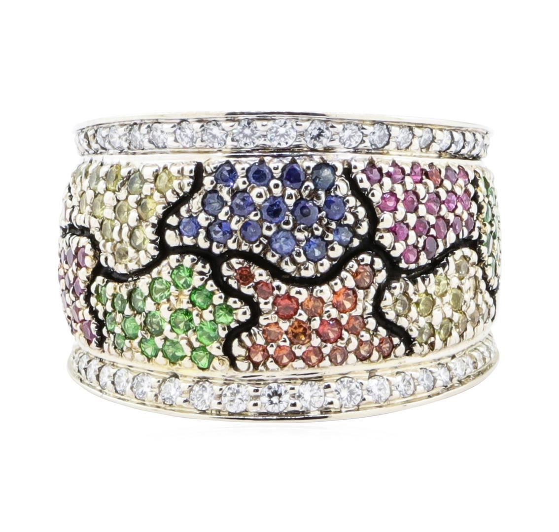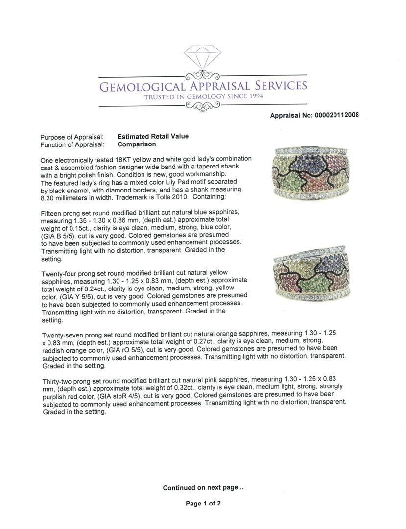 One electronically tested 18KT yellow and white gold lady's combination cast & assembled fashion designer wide band with a tapered shank with a bright polish finish. The featured lady's ring has a mixed color Lily Pad motif separated by black enamel, with diamond borders, and has a shank measuring 8.30 millimeters in width. Trademark is Tolle 2010. Condition is new, good workmanship. Containing: Fifteen prong set round modified brilliant cut natural blue sapphires, measuring 1.35 - 1.30 x 0.86 mm, (depth est.) approximate total weight of 0.15ct., clarity is eye clean, medium, strong, blue color, (GIA B 5/5), cut is very good. Colored gemstones are presumed to have been subjected to commonly used enhancement processes. Transmitting light with no distortion, transparent. Graded in the setting. Twenty-four prong set round modified brilliant cut natural yellow sapphires, measuring 1.30 - 1.25 x 0.83 mm, (depth est.) approximate total weight of 0.24ct., clarity is eye clean, medium, strong, yellow color, (GIA Y 5/5), cut is very good. Colored gemstones are presumed to have been subjected to commonly used enhancement processes. Transmitting light with no distortion, transparent. Graded in the setting. Twenty-seven prong set round modified brilliant cut natural orange sapphires, measuring 1.30 - 1.25 x 0.83 mm, (depth est.) approximate total weight of 0.27ct., clarity is eye clean, medium, strong, reddish orange color, (GIA rO 5/5), cut is very good. Colored gemstones are presumed to have been subjected to commonly used enhancement processes. Transmitting light with no distortion, transparent. Graded in the setting. Thirty-two prong set round modified brilliant cut natural pink sapphires, measuring 1.30 - 1.25 x 0.83 mm, (depth est.) approximate total weight of 0.32ct., clarity is eye clean, medium light, strong, strongly purplish red color, (GIA stpR 4/5), cut is very good. Colored gemstones are presumed to have been subjected to commonly used enhancement processes. Transmitting light with no distortion, transparent. Graded in the setting. Twenty-six prong set round modified brilliant cut natural tsavorite garnets, measuring 1.35 - 1.25 x 0.85 mm, (depth est.) approximate total weight of 0.26ct., clarity is eye clean, medium, strong, slightly yellowish green color, (GIA slyG 5/5), cut is very good. Colored gemstones are presumed to have been subjected to commonly used enhancement processes. Transmitting light with no distortion, transparent. Graded in the setting. Sixty prong set round brilliant cut diamonds, measuring 1.40 - 1.00 x 0.74mm (depth est.) approximate total weight of 60 Stones = 0.40 ct. Graded in the setting. Color F - G Clarity VVS-2 to VS-2 Cut Excellent. Total Weight of Colored Stones 1.24ct.. Total Weight of Diamonds 0.40 ct.. Total Weight of Wide Band 8.90gm GAS Appraised at $3600.00. GAS Appraised.