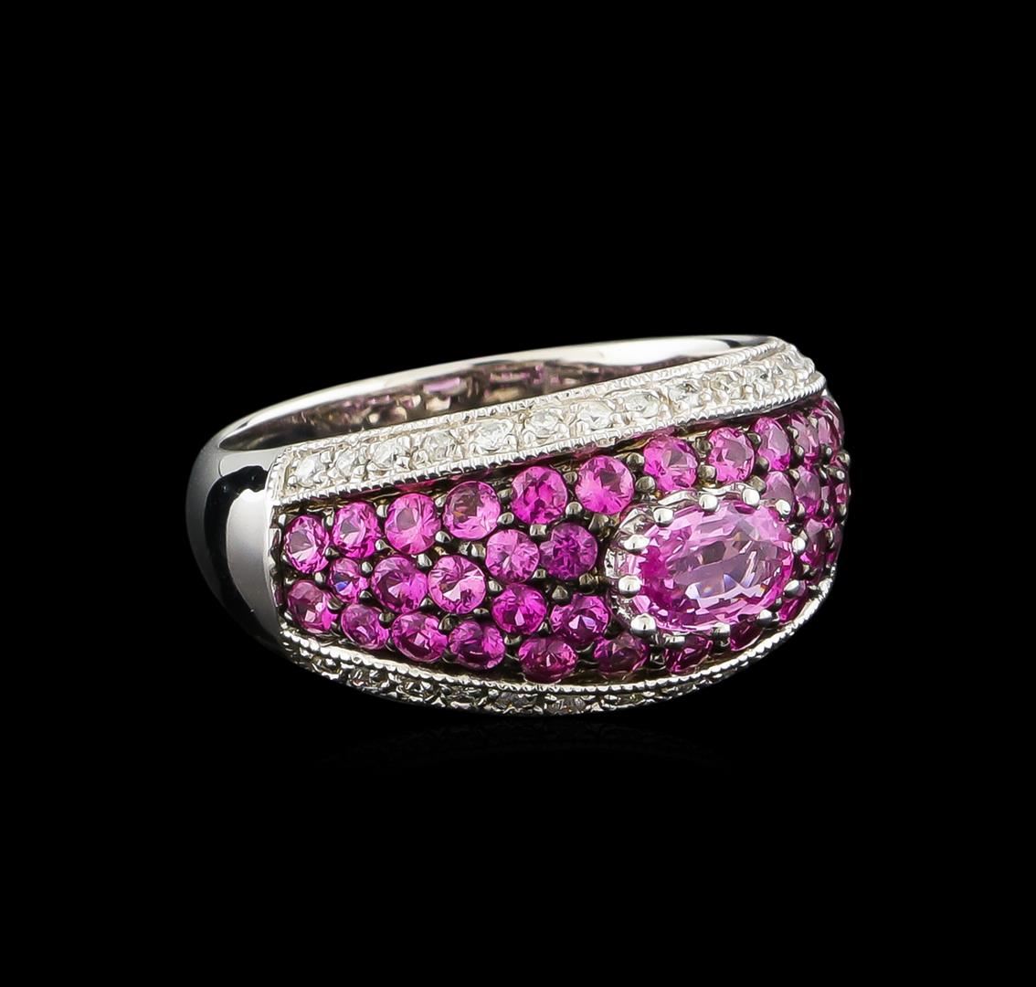 One electronically tested 10KT white gold ladies cast pink sapphire and diamond ring. The featured pink sapphire is set within a pink sapphire curvature supported by mirroring diamond ribbons, completed by a three and one-half millimeter wide band. Bright polish finish with milgrain detailing. Trademark is RI. Identified with markings of "10K". Condition is new, good workmanship. Containing: One prong set oval mixed cut natural pink sapphire, measuring 5.70 x 4.00 x 2.00mm, approximate weight of 0.40ct., clarity is eye clean, medium, very slightly grayish, pink color, (GIA Pk 5/3), cut is good. Transmitting light with no distortion, transparent. Graded in the setting. Thirty-eight bead set round mixed cut natural pink sapphires, measuring 1.90 - 1.70 x 1.17 mm, approximate total weight of 1.24ct., clarity is eye clean, medium, very slightly grayish, pink color, (GIA Pk 5/3), cut is good. Transmitting light with no distortion, transparent. Color grade is an average for the group. Graded in the setting. Thirty bead set round brilliant cut diamonds, measuring 1.20 - 1.10 x 0.69mm (depth est.) approximate total weight of 30 Stones = 0.20ct. Graded in the setting. Clarity: I-1 to I-2. Color: F - H. Total Weight of Colored Stones 1.64ct. Total Weight of Diamonds 0.20ct. Total Weight of Ring 5.09gm. AIG Appraised at $1,955.00.
