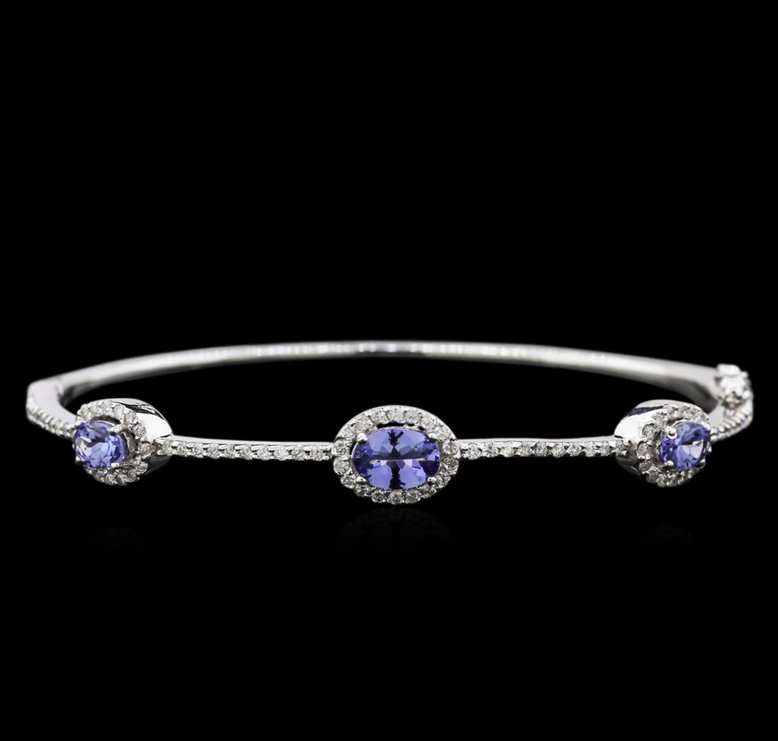 One electronically tested 14KT white gold lady's combination cast & assembled fashion bangle bracelet with a concealed clasp with foldover safety with a bright polish finish. The featured lady's bangle bracelet measures approximately 7 inches in length/diameter. Identified with markings of "K14". Condition is new, good workmanship. Containing: One prong set oval modified brilliant cut natural tanzanite, measuring 7.00 x 4.94 x 2.89mm, approximate weight of 0.71ct., clarity is eye clean, type I, medium light, very slightly grayish, bluish violet color, (GIA bV 4/3), cut is good. Transmitting light with no distortion, transparent. Colored gemstones are presumed to have been subjected to commonly used enhancement processes. Graded in the setting. Two prong set oval modified brilliant cut natural tanzanites, measuring 5.92 x 3.94 x 2.87mm, approximate total weight of 0.93ct., clarity is eye clean, type I, medium light, very slightly grayish, bluish violet color, (GIA bV 4/3), cut is good. Transmitting light with no distortion, transparent. Colored gemstones are presumed to have been subjected to commonly used enhancement processes. Graded in the setting. Ninety-Four prong set round brilliant cut diamonds, measuring 1.35 - 1.25 x 0.78mm (depth est.) approximate total weight of 94 Stones = 0.76ct. Graded in the setting. Clarity: SI-1 to I-1. Color: G - I. Cut Good. Total Weight of Colored Stones 1.64ct. Total Weight of Diamonds 0.76ct. Total Weight of Bangle Bracelet 11.90gm. GAS Appraised at $4,995.00.