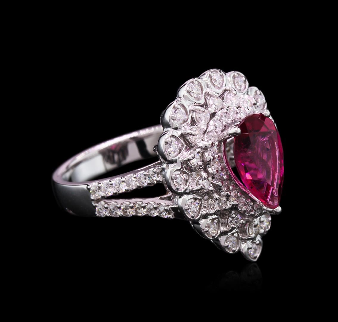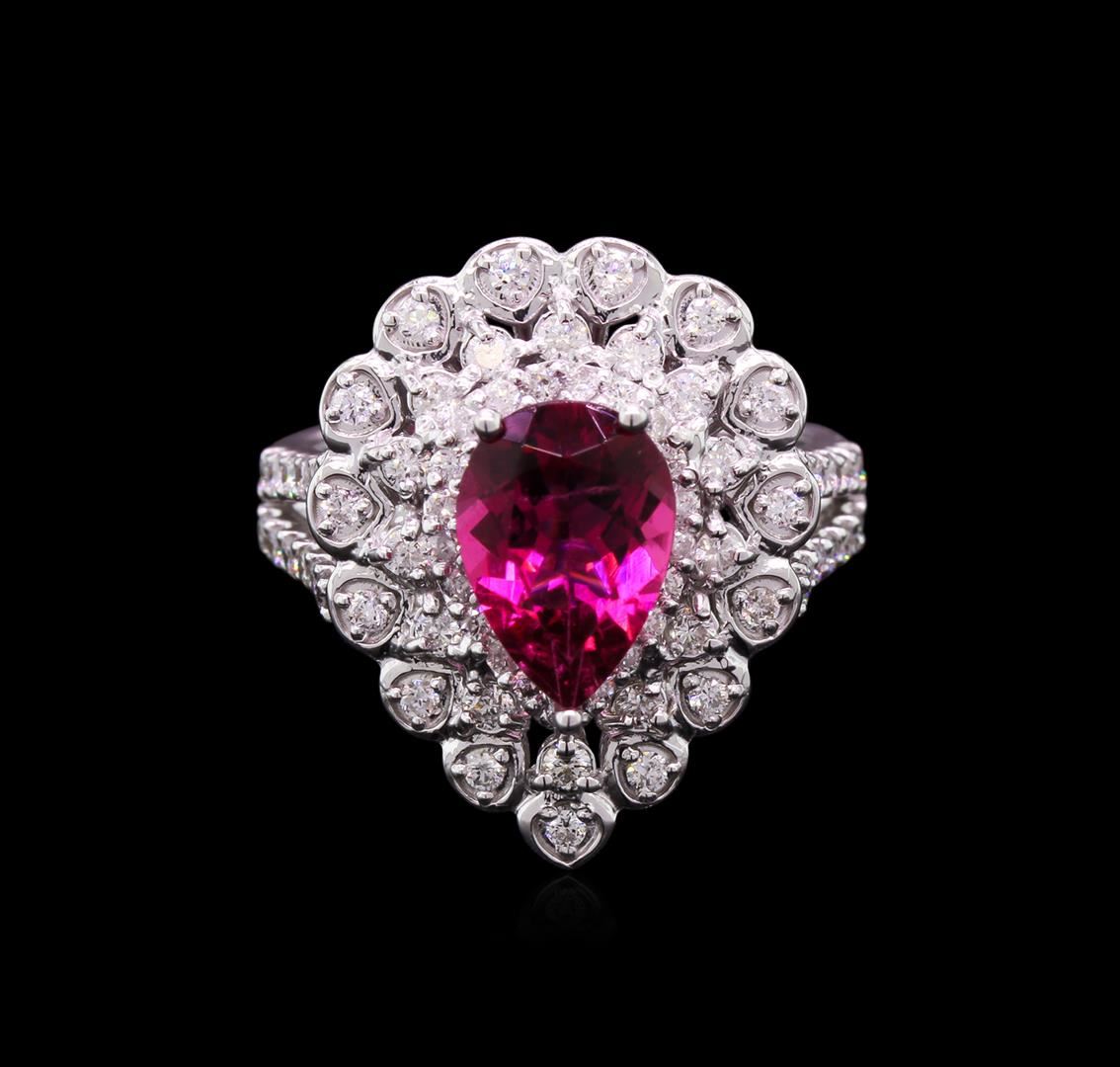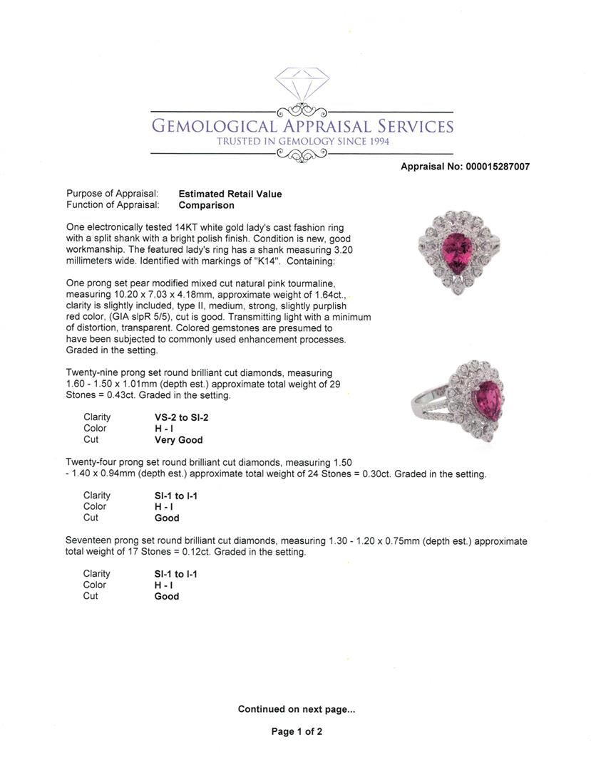 One electronically tested 14KT white gold lady's cast fashion ring with a split shank with a bright polish finish. The featured lady's ring has a shank measuring 3.20 millimeters wide. Identified with markings of "K14". Condition is new, good workmanship. Containing: One prong set pear modified mixed cut natural pink tourmaline, measuring 10.20 x 7.03 x 4.18mm, approximate weight of 1.64ct., clarity is slightly included, type II, medium, strong, slightly purplish red color, (GIA slpR 5/5), cut is good. Transmitting light with a minimum of distortion, transparent. Colored gemstones are presumed to have been subjected to commonly used enhancement processes. Graded in the setting. Twenty-Nine prong set round brilliant cut diamonds, measuring 1.60 - 1.50 x 1.01mm (depth est.) approximate total weight of 29 Stones = 0.43ct. Graded in the setting. Clarity: VS-2 to SI-2. Color: H - I. Cut Very Good Twenty-Four prong set round brilliant cut diamonds, measuring 1.50 - 1.40 x 0.94mm (depth est.) approximate total weight of 24 Stones = 0.30ct. Graded in the setting. Clarity: SI-1 to I-1. Color: H - I. Cut Good Seventeen prong set round brilliant cut diamonds, measuring 1.30 - 1.20 x 0.75mm (depth est.) approximate total weight of 17 Stones = 0.12ct. Graded in the setting. Clarity: SI-1 to I-1. Color: H - I. Cut Good. Total Weight of Colored Stones 1.64ct. Total Weight of Diamonds 0.85ct. Total Weight of Ring 7.30gm. GAS Appraised at $5,010.00.