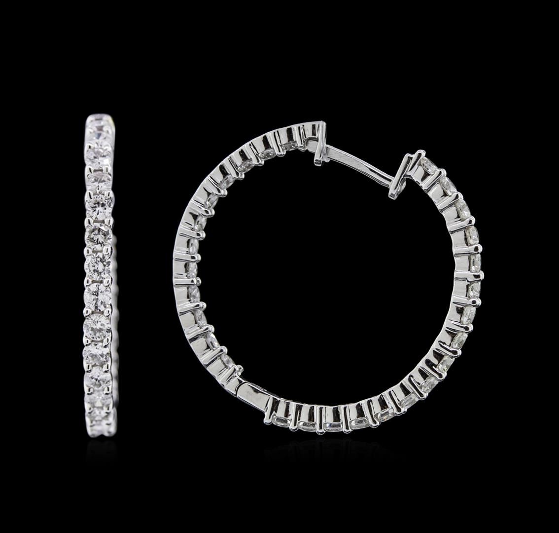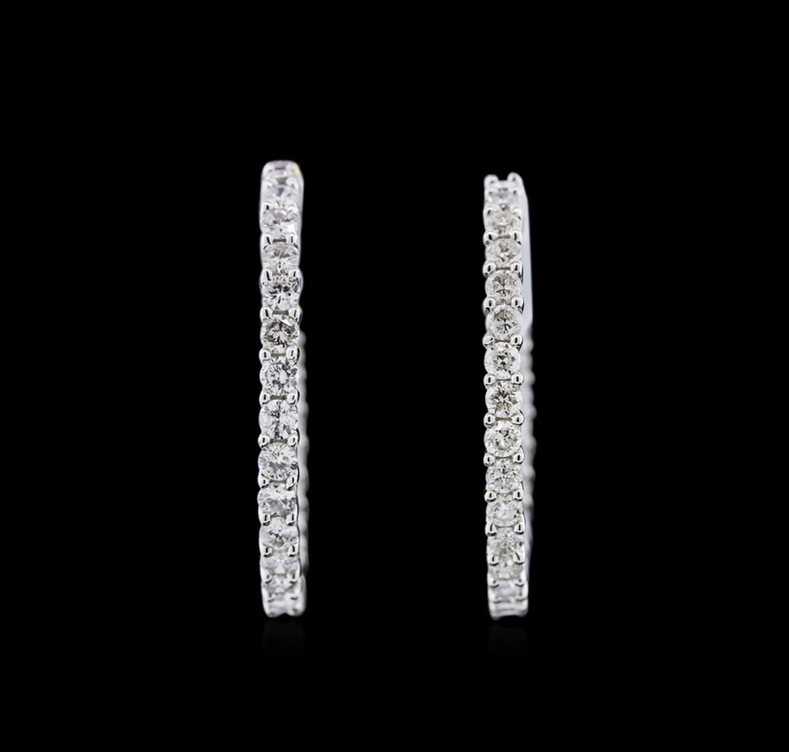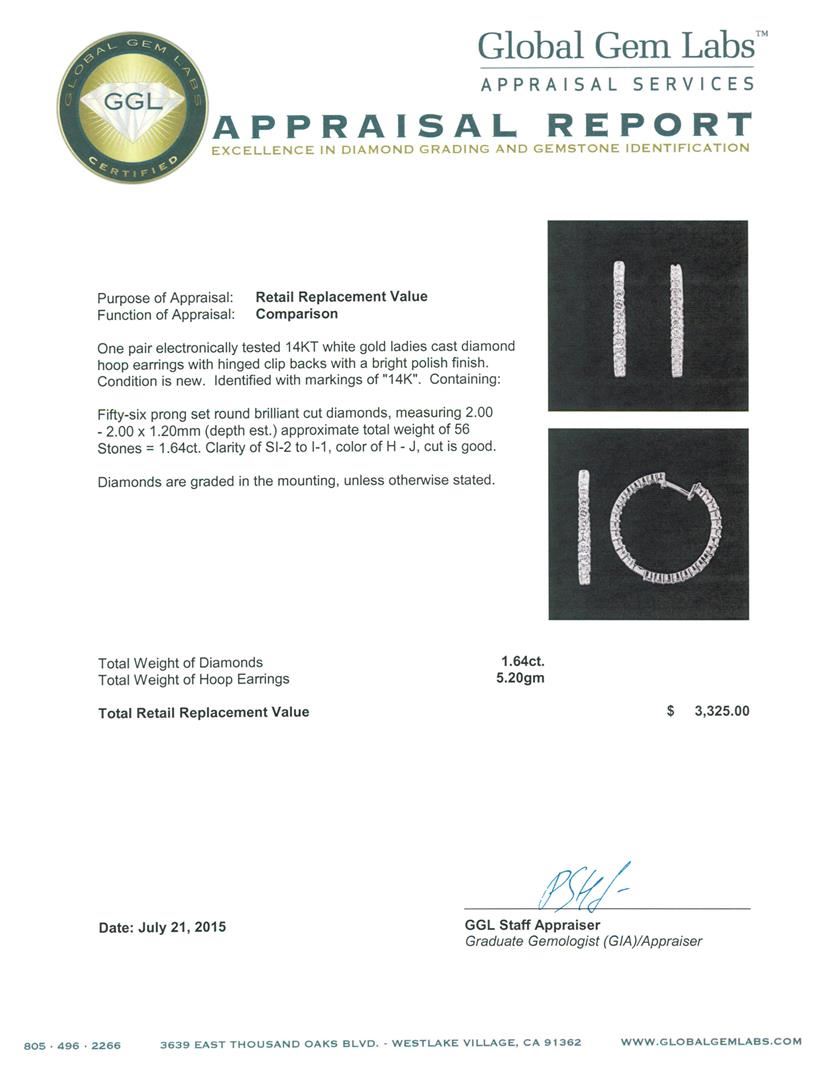 One pair electronically tested 14KT white gold ladies cast diamond hoop earrings with hinged clip backs with a bright polish finish. Identified with markings of "14K". Condition is new. Containing: Fifty-Six prong set round brilliant cut diamonds, measuring 2.00 - 2.00 x 1.20mm (depth est.) approximate total weight of 56 Stones = 1.64ct. Clarity: SI-2 to I-1. Color: H - J, Cut is Good. Diamonds are graded in the mounting, unless otherwise stated. Total Weight of Diamonds 1.64ct. Total Weight of Hoop Earrings 5.20gm. GGL Appraised at $3,325.00.
