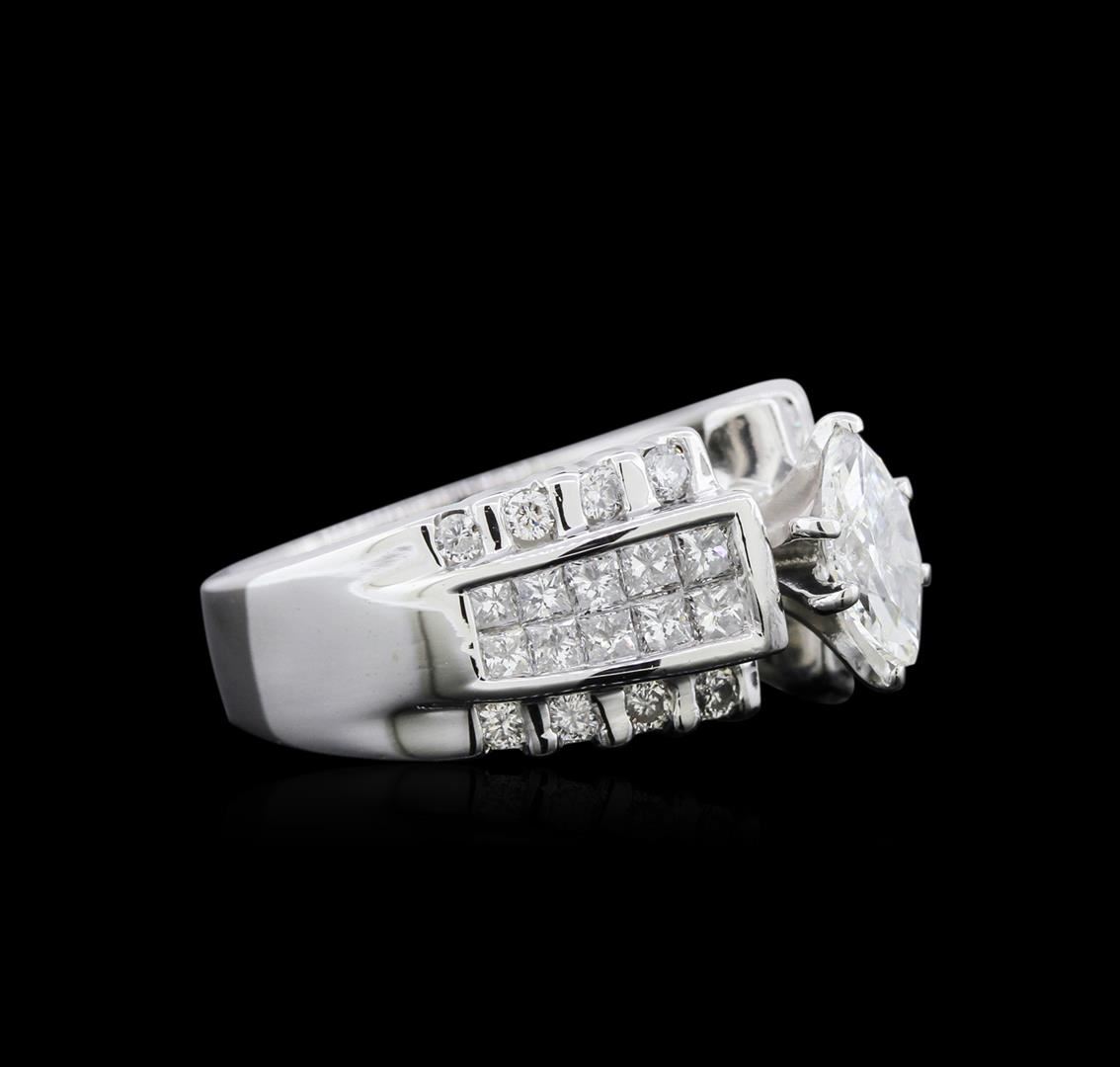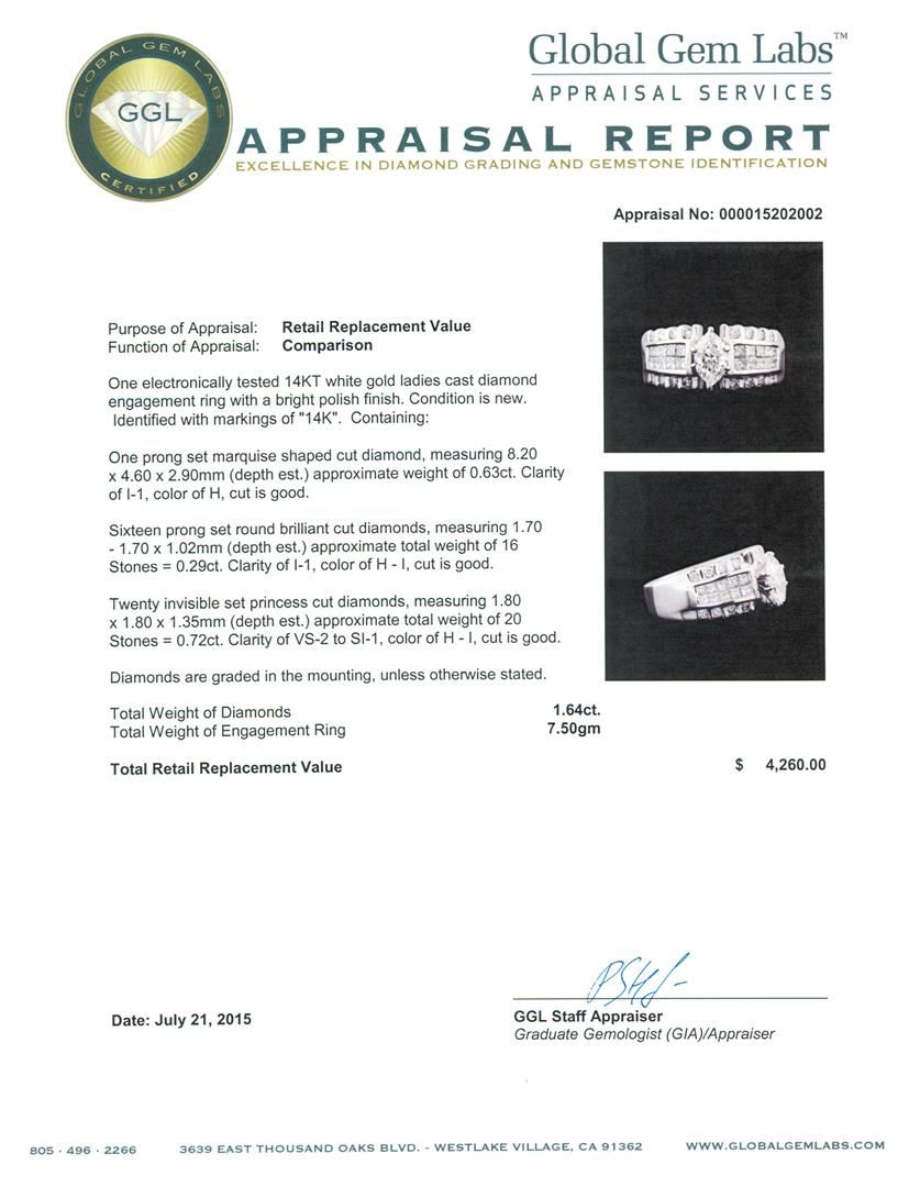 One electronically tested 14KT white gold ladies cast diamond engagement ring with a bright polish finish. Identified with markings of "14K". Condition is new. Containing: One prong set marquise shaped cut diamond, measuring 8.20 x 4.60 x 2.90mm (depth es GGL Appraised at $4,260.00.