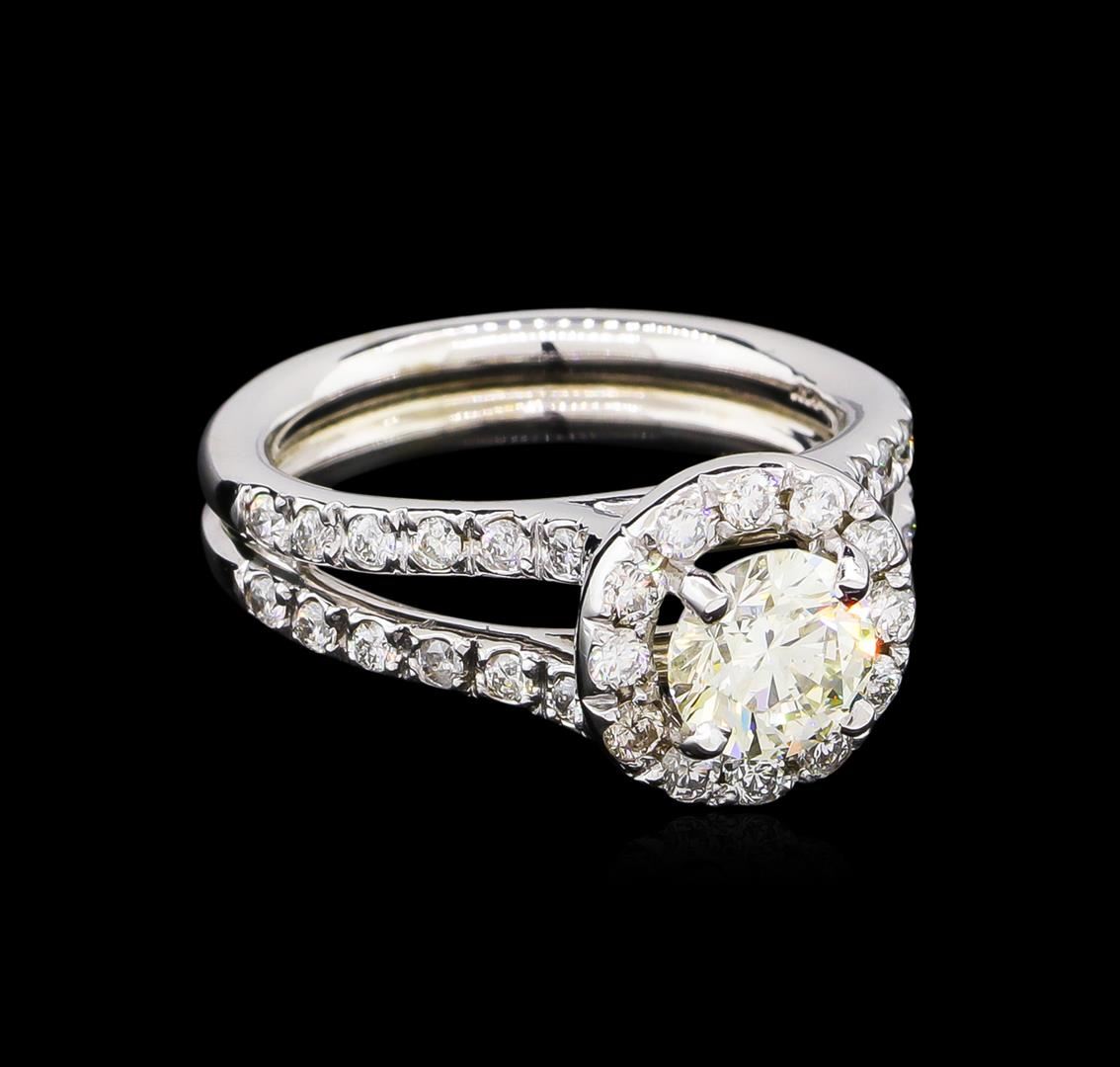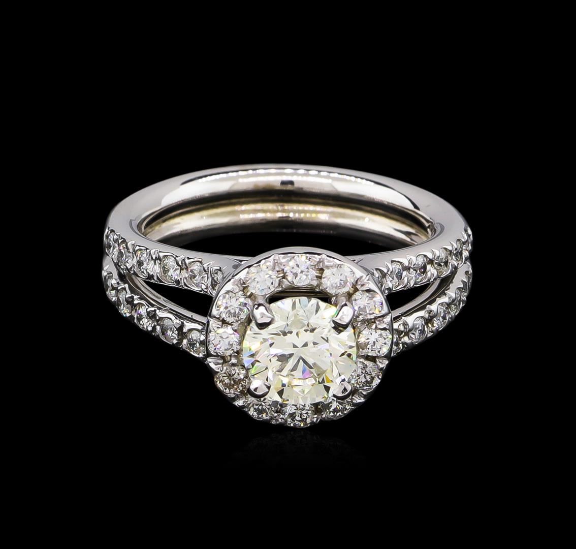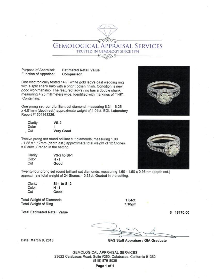 One electronically tested 14KT white gold lady's cast wedding ring with a split shank halo with a bright polish finish. The featured lady's ring has a double shank measuring 4.25 millimeters wide. Identified with markings of "14K". Condition is new, good workmanship. Containing: One prong set round brilliant cut diamond, measuring 6.31 - 6.25 x 4.01mm (depth est.) approximate weight of 1.01ct. EGL Laboratory Report #1501863226. Clarity: VS-2. Color: I. Cut Very Good Twelve prong set round brilliant cut diamonds, measuring 1.90 - 1.85 x 1.17mm (depth est.) approximate total weight of 12 Stones = 0.30ct. Graded in the setting. Clarity: VS-2 to SI-1. Color: H - I. Cut Good Twenty-Four prong set round brilliant cut diamonds, measuring 1.60 - 1.50 x 0.95mm (depth est.) approximate total weight of 24 Stones = 0.33ct. Graded in the setting. Clarity: SI-1 to SI-2. Color: H - I. Cut Good. Total Weight of Diamonds 1.64ct. Total Weight of Ring 7.10gm. GAS Appraised at $16,170.00.