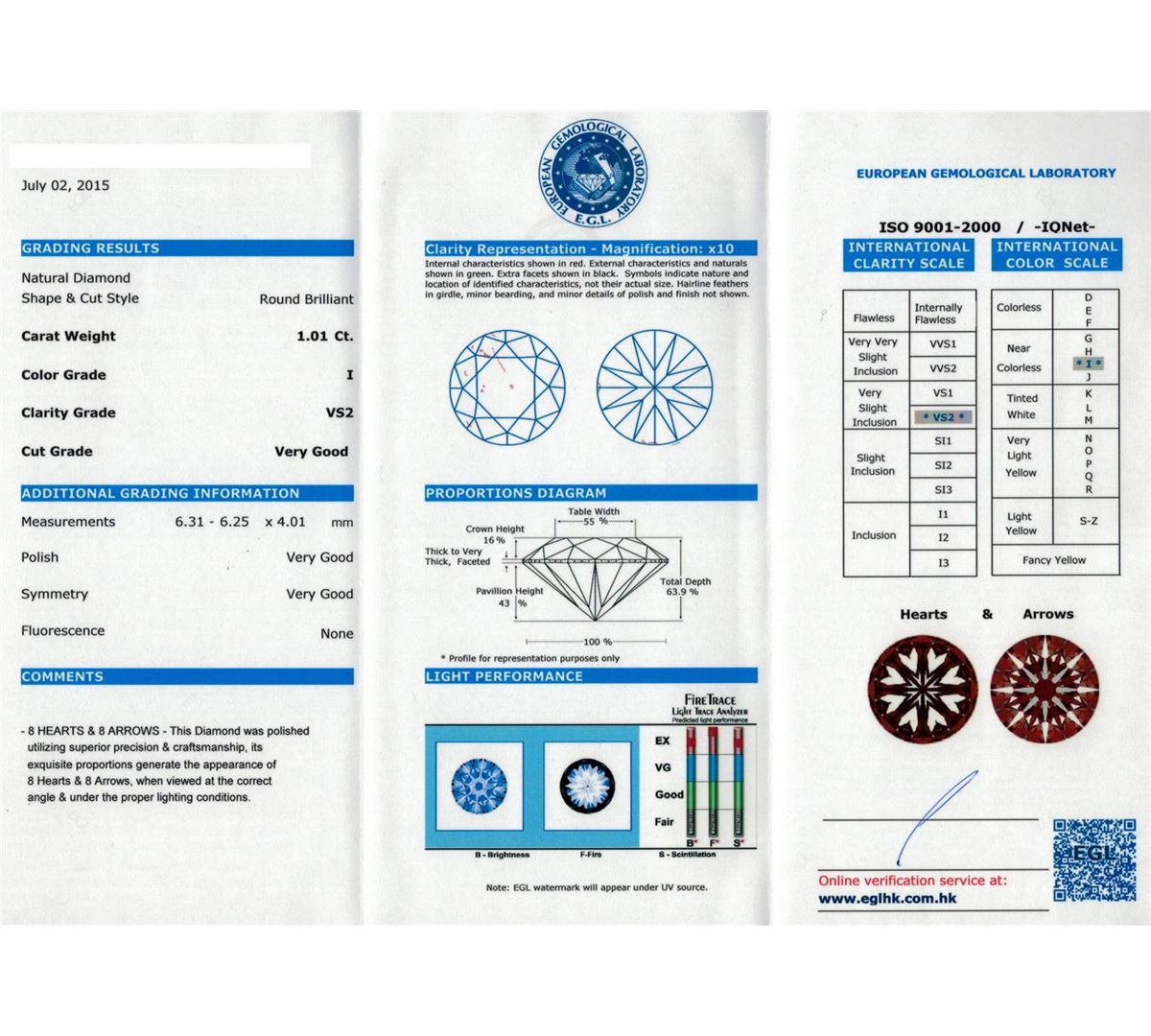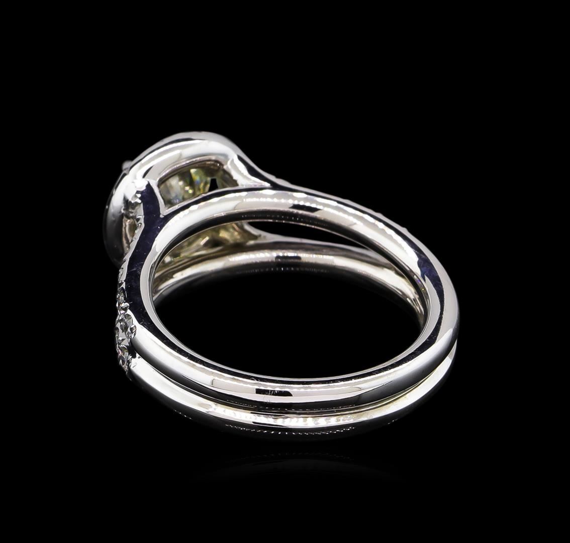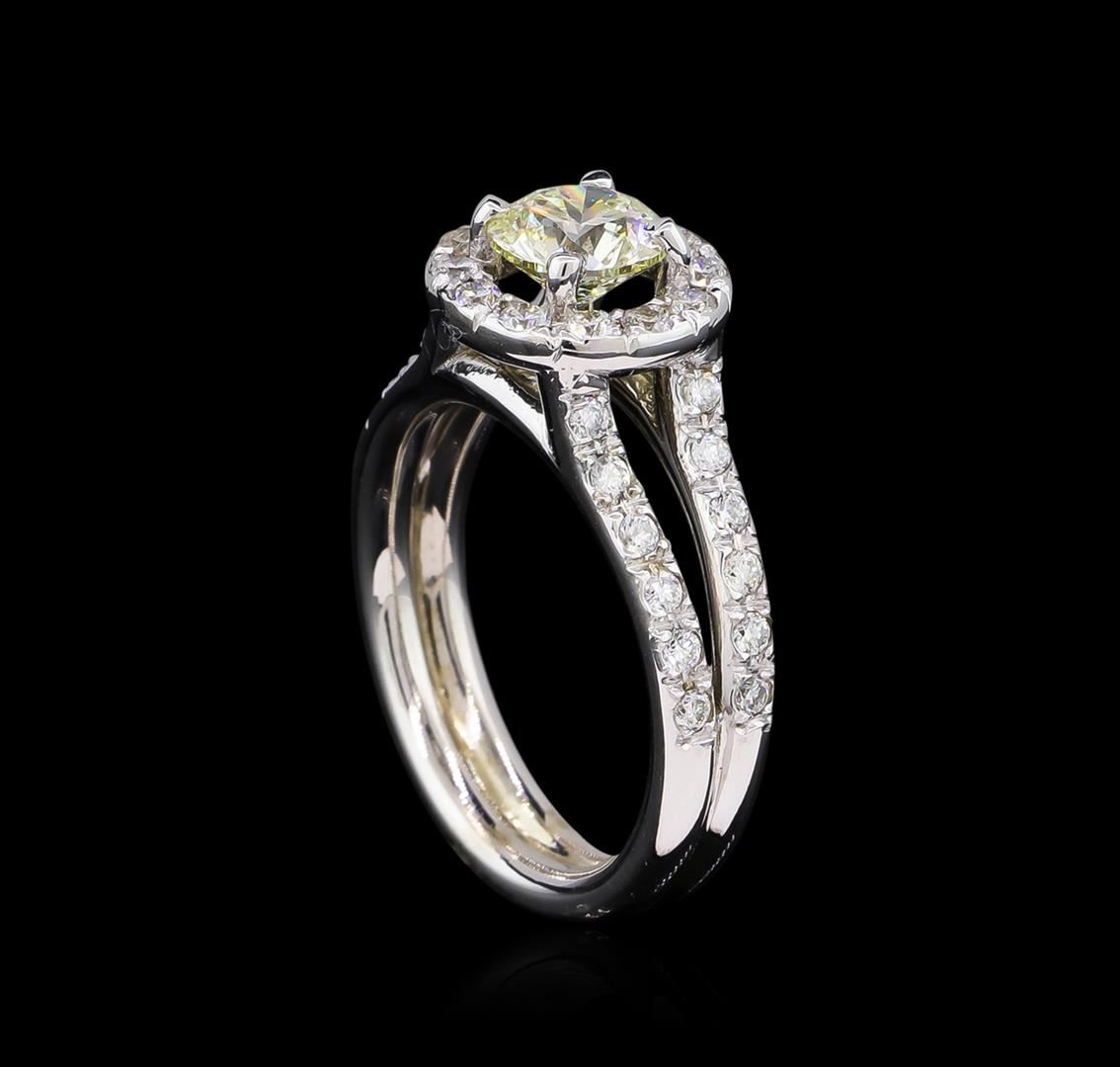 One electronically tested 14KT white gold lady's cast wedding ring with a split shank halo with a bright polish finish. The featured lady's ring has a double shank measuring 4.25 millimeters wide. Identified with markings of "14K". Condition is new, good workmanship. Containing: One prong set round brilliant cut diamond, measuring 6.31 - 6.25 x 4.01mm (depth est.) approximate weight of 1.01ct. EGL Laboratory Report #1501863226. Clarity: VS-2. Color: I. Cut Very Good Twelve prong set round brilliant cut diamonds, measuring 1.90 - 1.85 x 1.17mm (depth est.) approximate total weight of 12 Stones = 0.30ct. Graded in the setting. Clarity: VS-2 to SI-1. Color: H - I. Cut Good Twenty-Four prong set round brilliant cut diamonds, measuring 1.60 - 1.50 x 0.95mm (depth est.) approximate total weight of 24 Stones = 0.33ct. Graded in the setting. Clarity: SI-1 to SI-2. Color: H - I. Cut Good. Total Weight of Diamonds 1.64ct. Total Weight of Ring 7.10gm. GAS Appraised at $16,170.00.