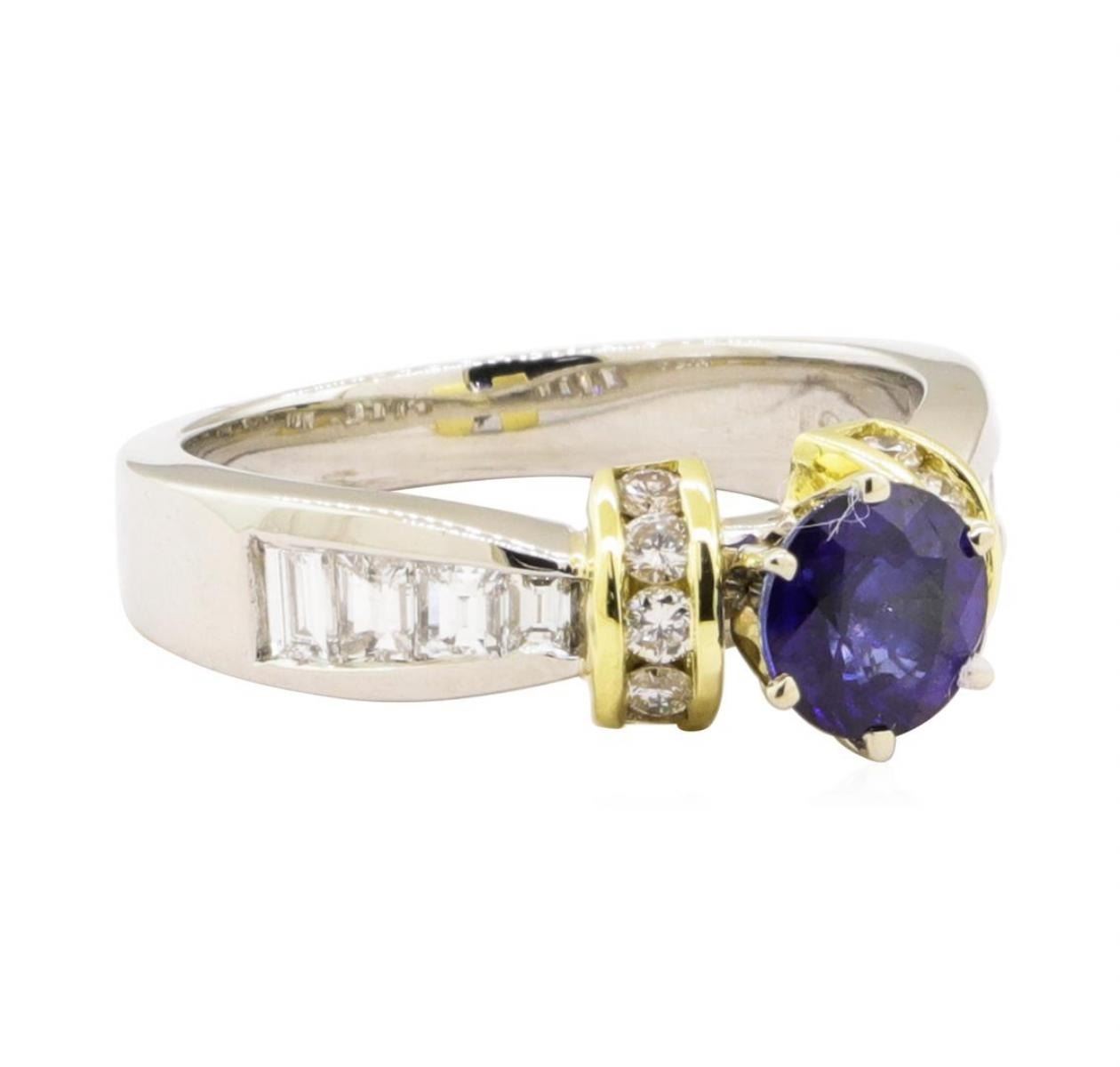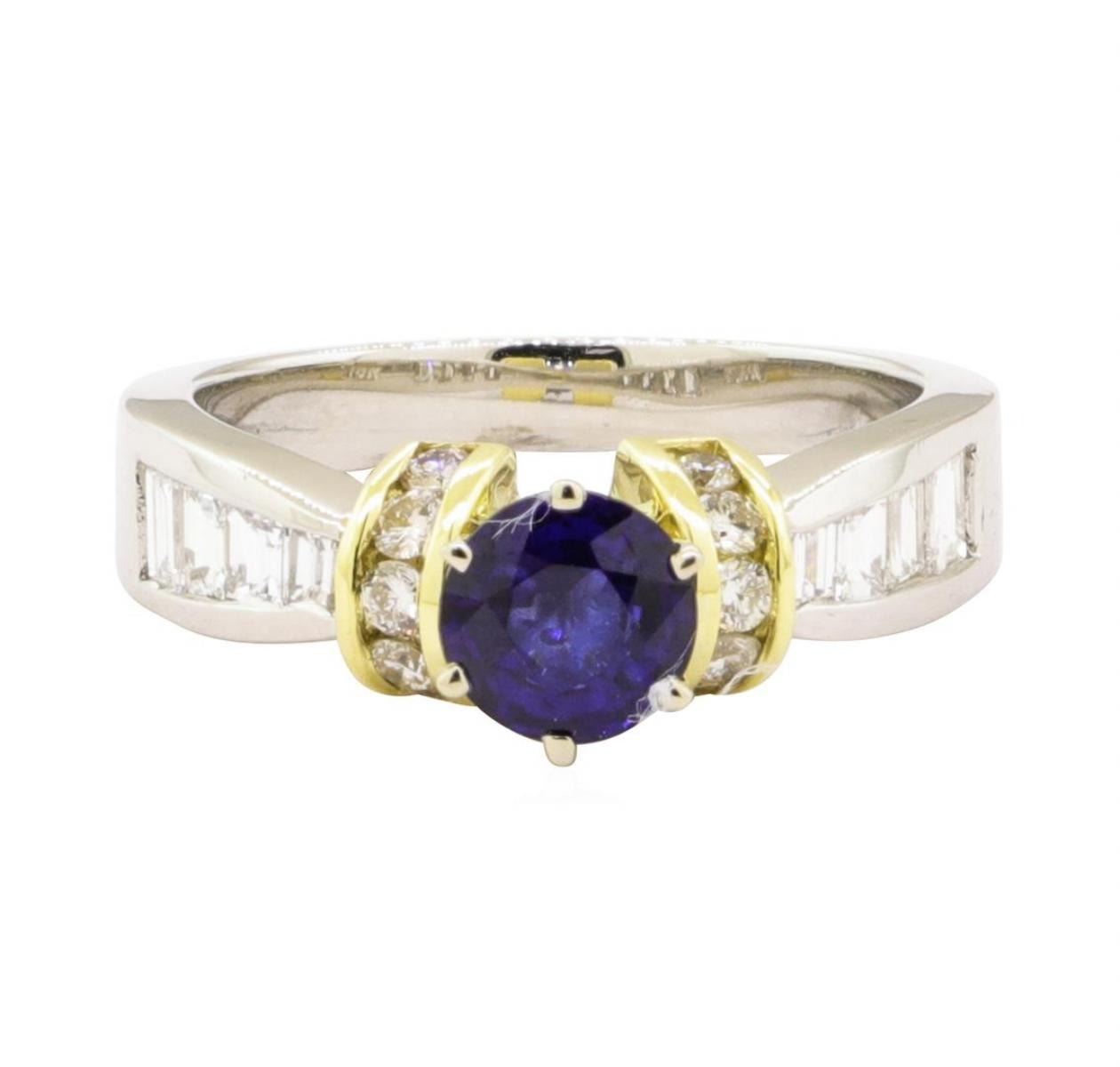 One electronically tested 18KT-platinum white and yellow gold lady's combination cast & assembled fashion ring with a pinched shank and cuff shoulders with a bright polish finish. The featured lady's ring has a shank measuring 2.75 millimeters wide. Identified with markings of 'PLTM / 18K'. Condition is new, good workmanship. Containing: One prong set round modified mixed cut natural blue sapphire, measuring 5.94 - 5.90 x 3.50 mm, (depth est.) approximate weight of 1.00 ct., clarity is slightly included, medium dark, moderately strong, violetish blue color, (GIA vB 6/4), cut is good. Transmitting light with a minimum of distortion, transparent. Colored gemstones are presumed to have been subjected to commonly used enhancement processes. Graded in the setting. Eight channel set baguette cut diamonds, measuring from 1.90 x 1.50 x 1.28mm (depth est.) to 3.00 x 1.90 x 1.62mm (depth est.) approximate total weight of 8 Stones = 0.45ct. Graded in the setting. Color H - I Clarity VS-2 to SI-1 Cut Very Good Ten channel set round brilliant cut diamonds, measuring 1.80 - 1.70 x 1.09mm (depth est.) approximate total weight of 10 Stones = 0.20 ct. Graded in the setting. Color H - I Clarity VS-2 to SI-1 Cut Good. Total Weight of Colored Stones 1.00 ct.. Total Weight of Diamonds 0.65ct.. Total Weight of Ring 7.70gm GAS Appraised at $4485.00. GAS Appraised.