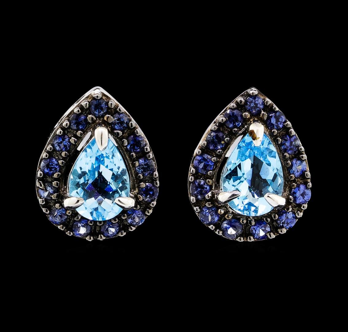 One pair of lady's earring featuring: 14KT white gold weighing 3.4 grams containing two blue topaz weighing 1.65ctw and blue sapphires weighing 0.45ctw.