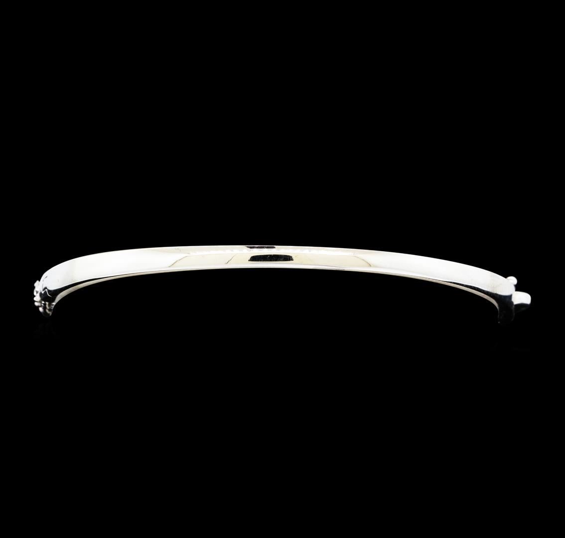 One electronically tested 14KT white gold lady's combination cast & assembled fashion bangle bracelet with a tongue clasp with foldover safety with a bright polish with milgrain detailing finish. The featured lady's bracelet measures approximately 7 inches in length. Identified with markings of 'K14'. Condition is new, good workmanship. Containing: Twenty-Five prong set round brilliant cut diamonds, measuring 2.60 - 2.55 x 1.60mm (depth est.) approximate total weight of 25 Stones = 1.65ct. Graded in the setting. Clarity SI-1 to I-1. Color: G - H Cut Good. Total Weight of Diamonds 1.65ct.. Total Weight of Bangle Bracelet 10.60gm. GAS Appraised at $5,430.00.