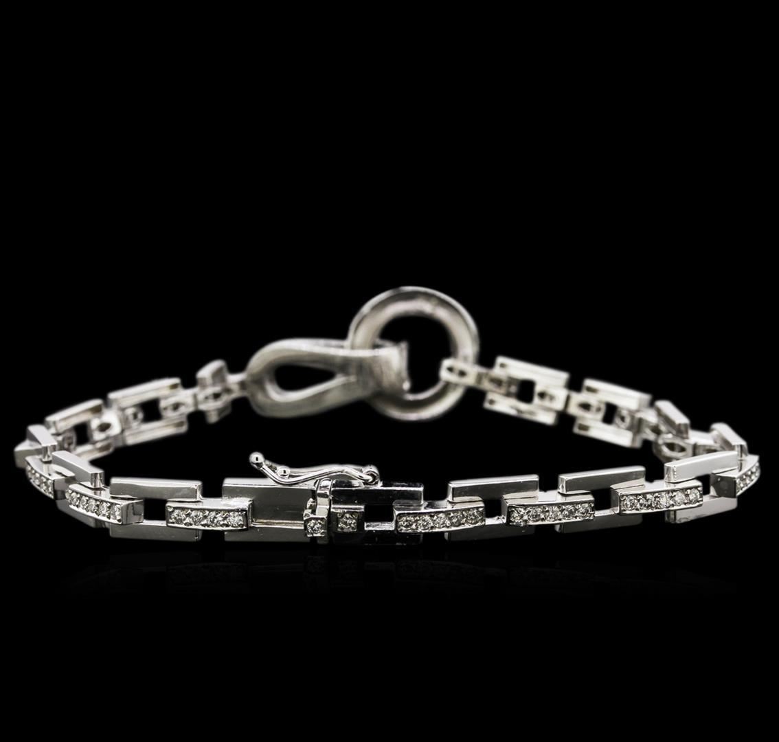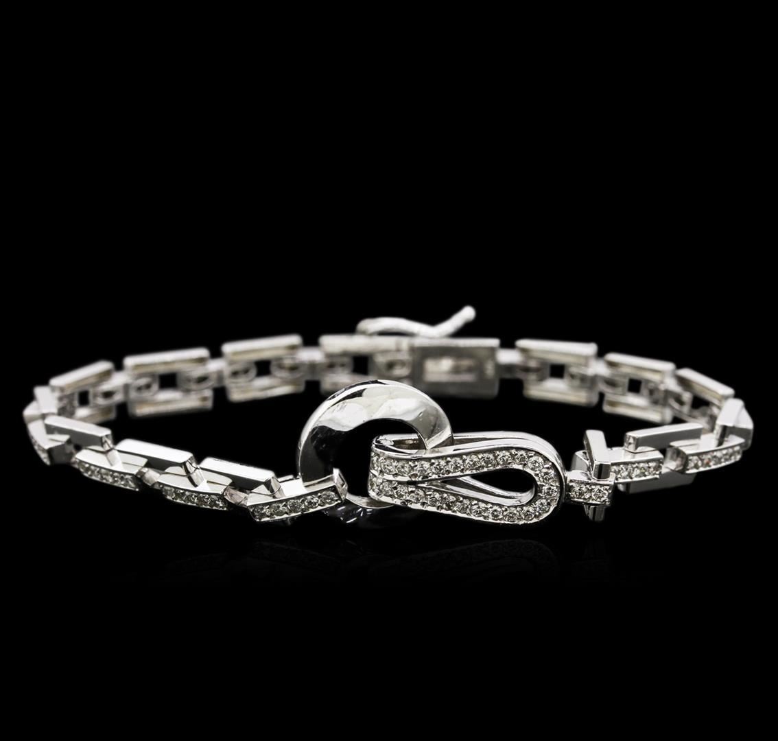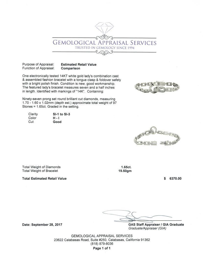 One electronically tested 14KT white gold lady's combination cast & assembled fashion bracelet with a tongue clasp & foldover safety with a bright polish finish. The featured lady's bracelet measures seven and a half inches in length. Identified with markings of '14K'. Condition is new, good workmanship. Containing: Ninety-Seven prong set round brilliant cut diamonds, measuring 1.70 - 1.60 x 1.02mm (depth est.) approximate total weight of 97 Stones = 1.65ct. Graded in the setting. Color H - I Clarity SI-1 to SI-3 Cut Good. Total Weight of Diamonds 1.65ct.. Total Weight of Bracelet 19.50gm GAS Appraised at $6370.00. GAS Appraised.