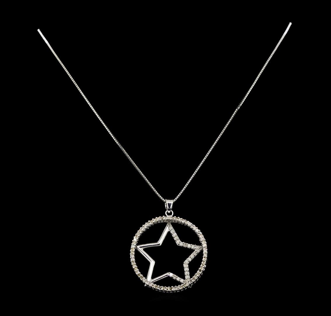 One electronically tested 10-14KT white gold lady's combination cast & assembled fashion pendant and chain 18.0' long,.8mm square box link with a lobster claw clasp with a bright polish finish. The featured lady's pendant is cast from 10KT white gold with a star inside a circle motif attached to a 14KT white gold chain. Identified with markings of '10K / 14K'. Condition is new, good workmanship. Containing: Sixty-Five prong set single cut diamonds, measuring 1.70 - 1.60 x 1.02mm (depth est.) approximate total weight of 65 Stones = 1.10ct. Graded in the setting. Color I - K Clarity SI-2 to I-1 Cut Good Twenty-Seven prong set round brilliant cut diamonds, measuring 1.80 - 1.70 x 1.08mm (depth est.) approximate total weight of 27 Stones = 0.55ct. Graded in the setting. Color I - J Clarity I-1 to I-2 Cut Good. Total Weight of Diamonds 1.65ct.. Total Weight of Pendant And Chain 8.70gm GAS Appraised at $3215.00. GAS Appraised at $3,215.00.