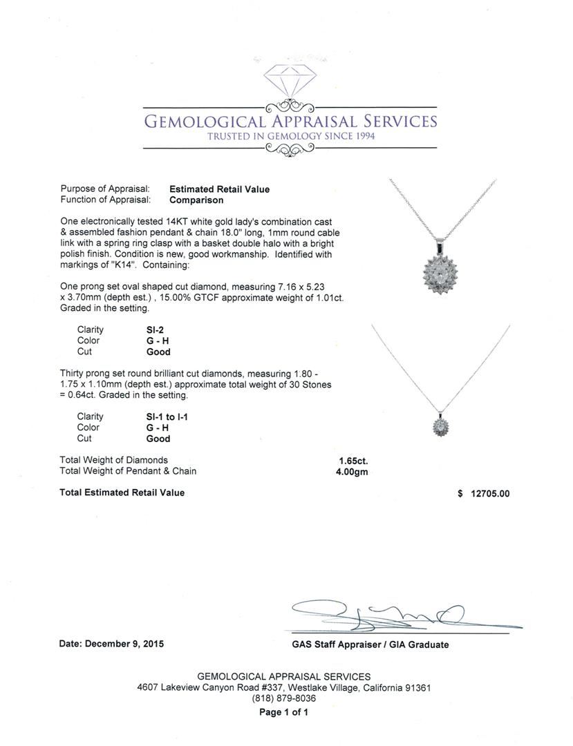 One electronically tested 14KT white gold lady's combination cast & assembled fashion pendant & chain 18.0" long, 1mm round cable link with a spring ring clasp with a basket double halo with a bright polish finish. Identified with markings of "K14". Condition is new, good workmanship. Containing: One prong set oval shaped cut diamond, measuring 7.16 x 5.23 x 3.70mm (depth est.) , 15.00.%. GTCF approximate weight of 1.01ct. Graded in the setting. Clarity: SI-2. Color: G - H. Cut Good Thirty prong set round brilliant cut diamonds, measuring 1.80 - 1.75 x 1.10mm (depth est.) approximate total weight of 30 Stones = 0.64ct. Graded in the setting. Clarity: SI-1 to I-1. Color: G - Good. Total Weight of Diamonds 1.65ct. Total Weight of Pendant & Chain 4.00gm. GAS Appraised at $12,705.00.