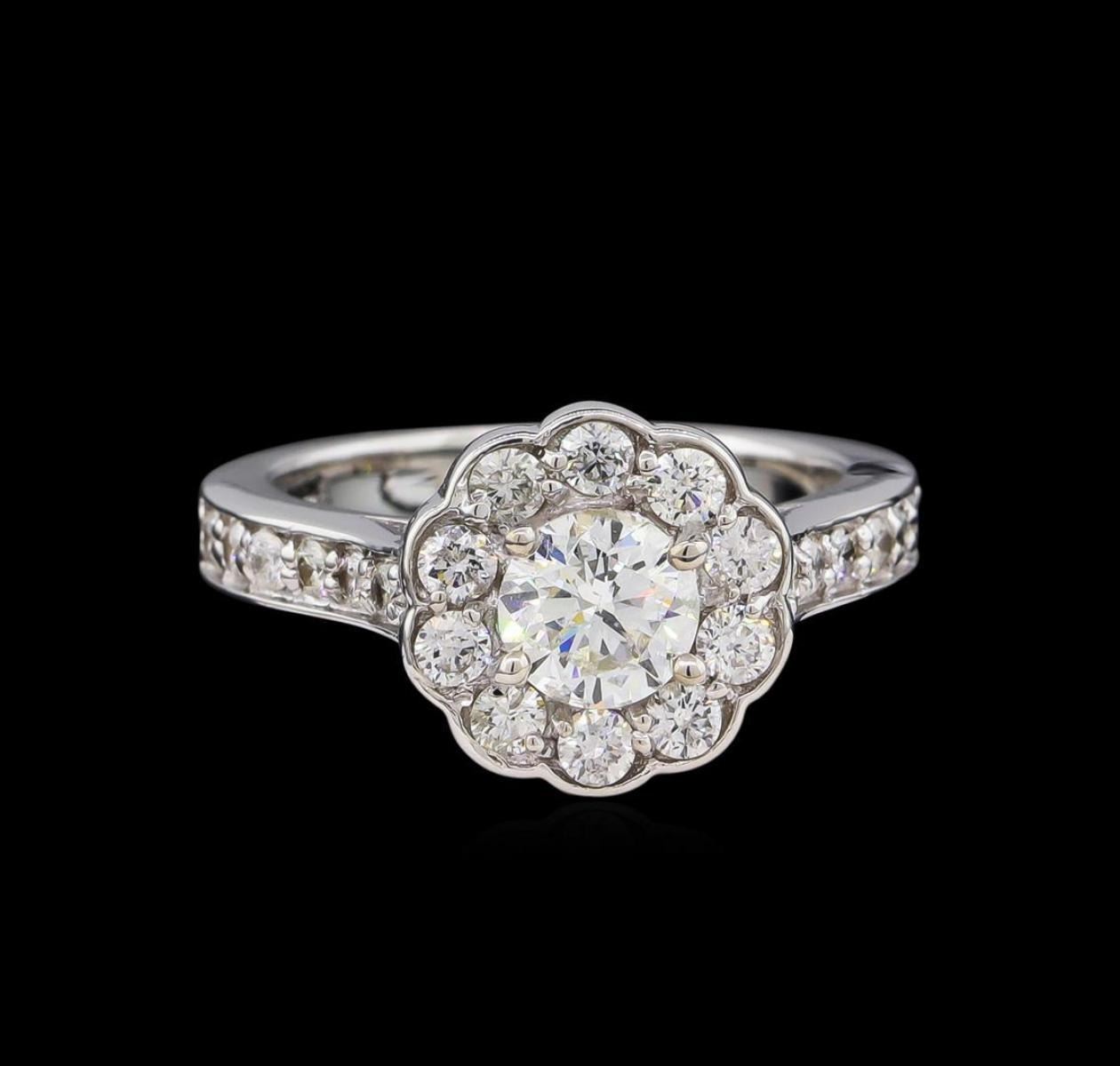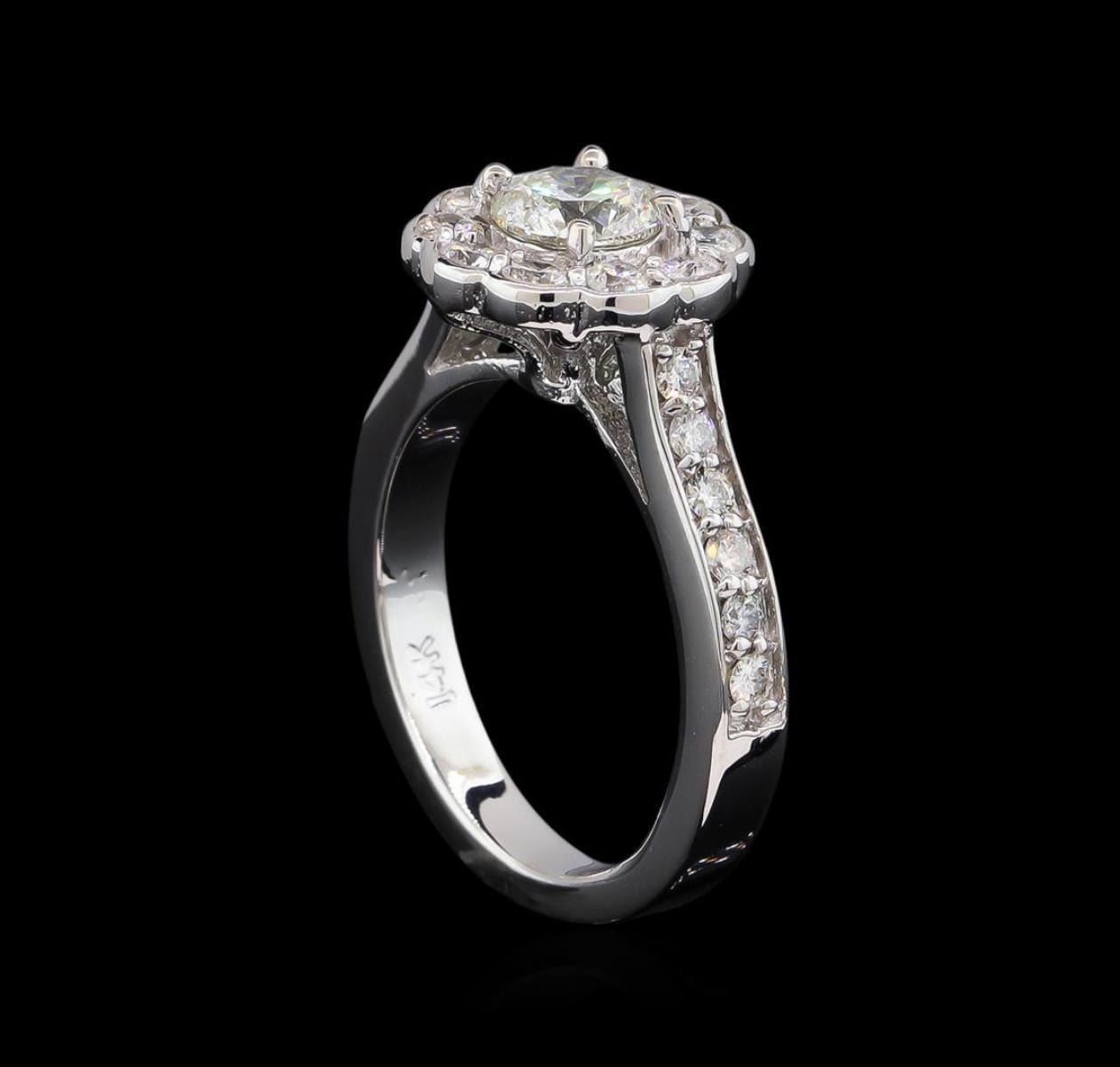 One electronically tested 14KT white gold lady's cast wedding ring with a scalloped halo with a bright polish finish. The featured lady's ring has a shank measuring 2.91 millimeters wide. Identified with markings of "14K". Condition is new, good workmanship. Containing: One prong set round brilliant cut diamond, measuring 5.98 - 5.95 x 3.65mm (depth est.) , 5.00.%. GTCF approximate weight of 0.85ct. Graded in the setting. Clarity: SI-2. Color: Very Good Ten prong set round brilliant cut diamonds, measuring 2.40 - 2.30 x 1.46mm (depth est.) approximate total weight of 10 Stones = 0.50ct. Graded in the setting. Clarity: SI-1 to SI-2. Color: G - Good Twelve prong set round brilliant cut diamonds, measuring 1.90 - 1.80 x 1.15mm (depth est.) approximate total weight of 12 Stones = 0.30ct. Graded in the setting. Clarity: SI-2 to I-1. Color: G - Good. Total Weight of Diamonds 1.65ct. Total Weight of Ring 6.30gm GAS Appraised.